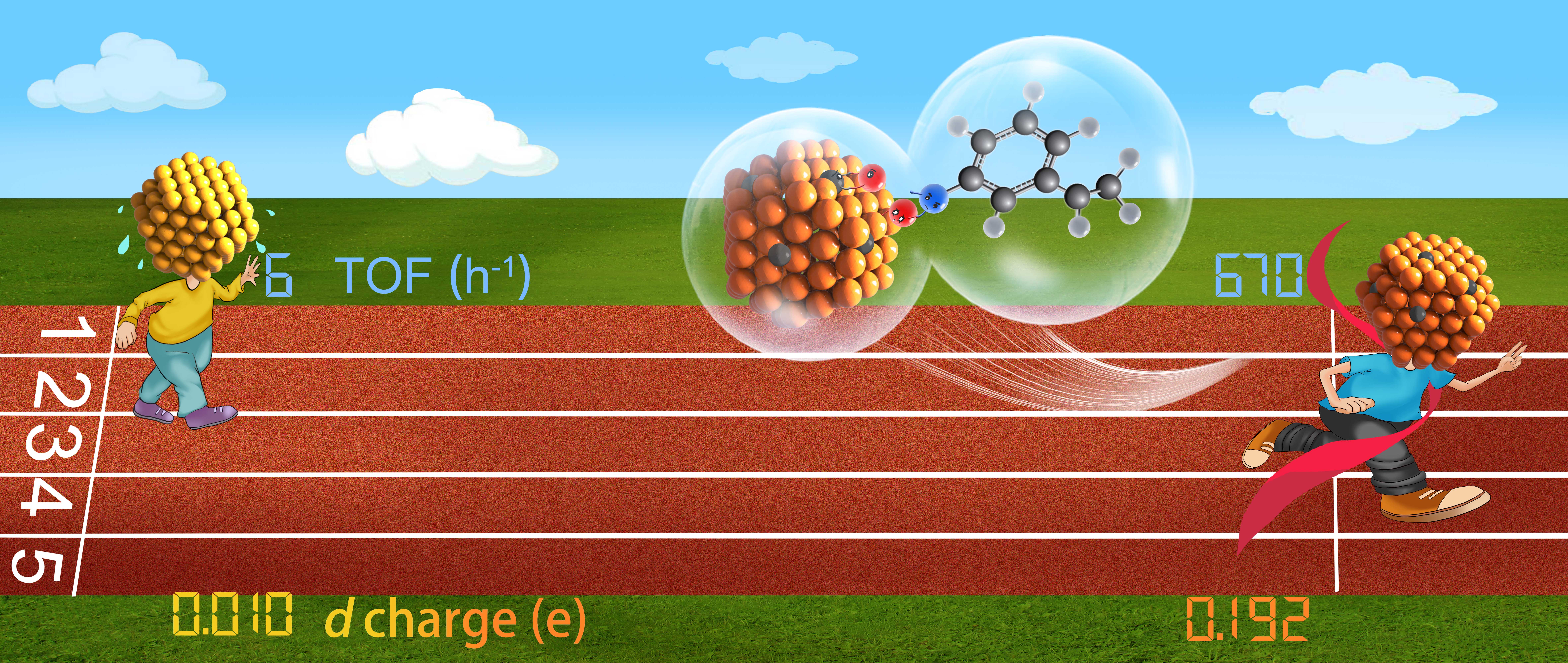 - With the increase of the d charge of Au, the adsorption activation entropy of 3-nitrostyrene is significantly changed and the hydrogenation activity is increased. The turn-over frequency (TOF) of the interstitial catalyst is 3 times that of a commercial Au/TiO2 catalyst, and the selectivity remains above 99%. A good linear dependence between d charge and turn-over frequency is found. Therefore, the d charge density of Au can be used as a descriptor.