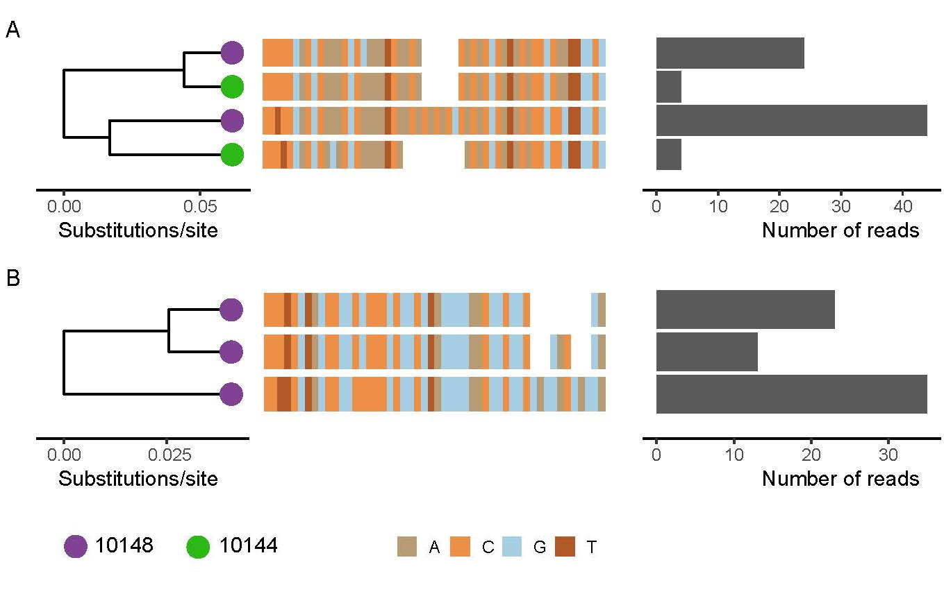 We also picked two herpes-positive saliva samples to undergo metagenomic sequencing, in order to get a complete genome for the herpesvirus. During the process of whole-genome reconstruction from sequence reads, it became clear that in a single sample, more than one strain of virus was present. This was both good and bad news.