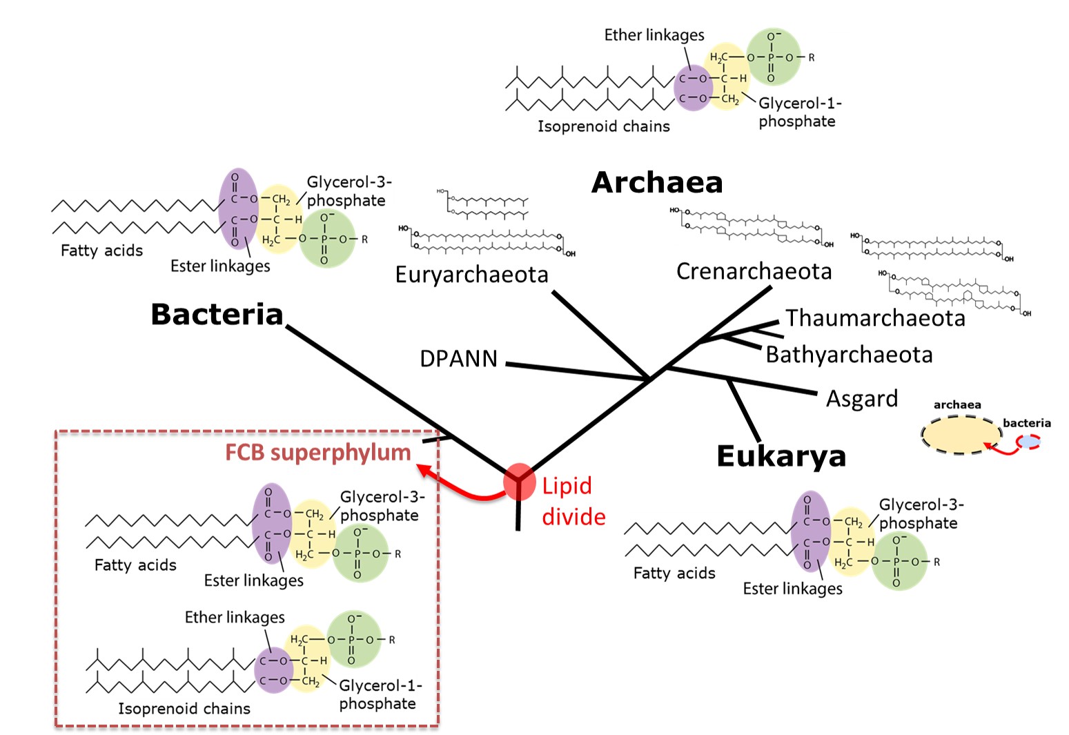 Cells are surrounded by a layer of lipids that protect them from changes in their environment such as temperature, much in the same way that our skin protects us from the cold or the sun. Membrane lipids are very stable in the environment, so when a cell dies, its membrane lipids preserve like a fossil which have been also used as biomarkers to reconstruct the climate on ancient Earth. Bacteria and eukaryotes have similar membrane lipids, while those of archaea are very different and believed to help them survive in extreme environments. This separation of membrane lipids, known as the ‘lipid divide’, was thought to have happened after the emergence of Bacteria and Archaea from the last universal common ancestor (LUCA), but the bacterial-like membrane of eukaryotes challenges this interpretation. Since eukaryotes evolved from a bacterial endosymbiosis into an archaeal cell, this would imply that the original “archaeal” membrane would have had to switch to a “bacterial” membrane with a possible transition period through a “mixed” membrane. Thus far, no microbes have been found in nature with the potential for a “mixed” lipid membrane, which would support this scenario.