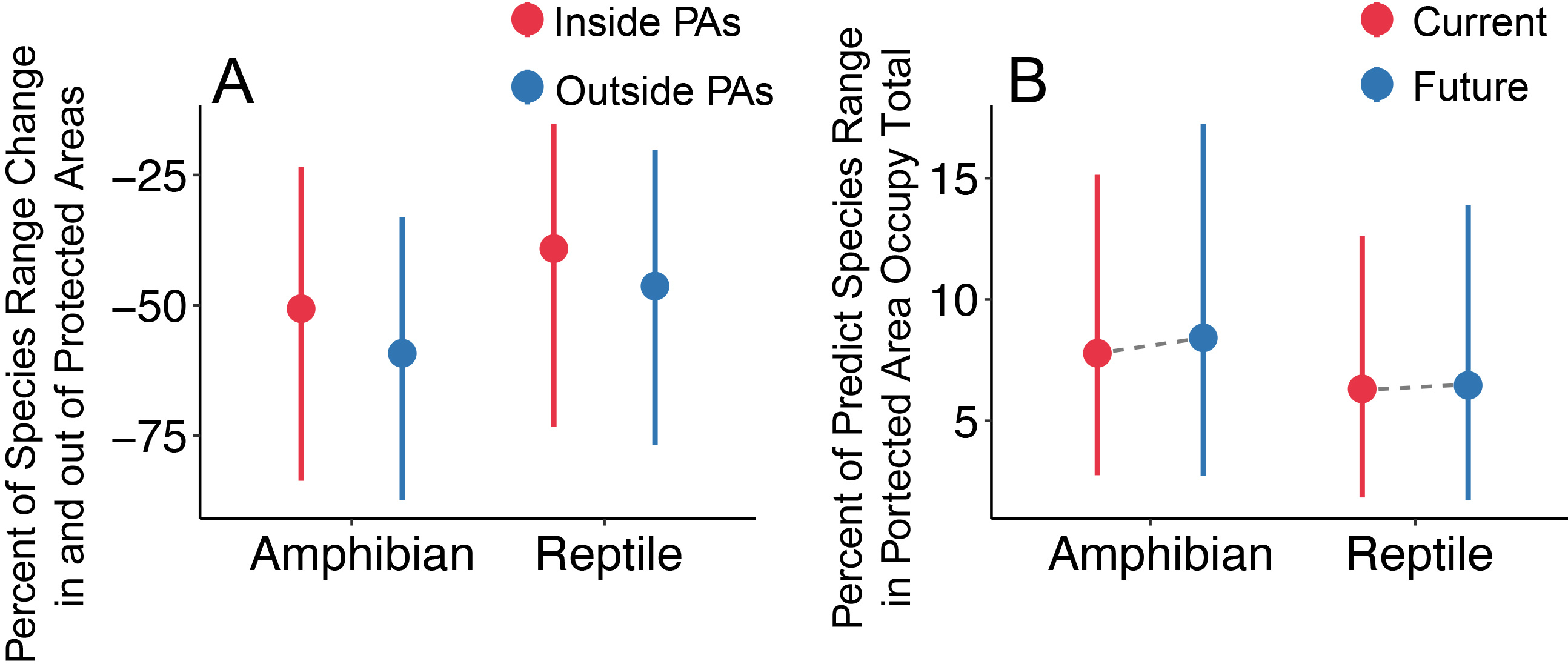 Fig. 3. Climate change impacts on the percentage of species range (area of habitat) inside and outside PAs by 2070. (A) Percent of species range change inside and outside PA; (B) Percent of predicted species range in PAs at present and by 2070.