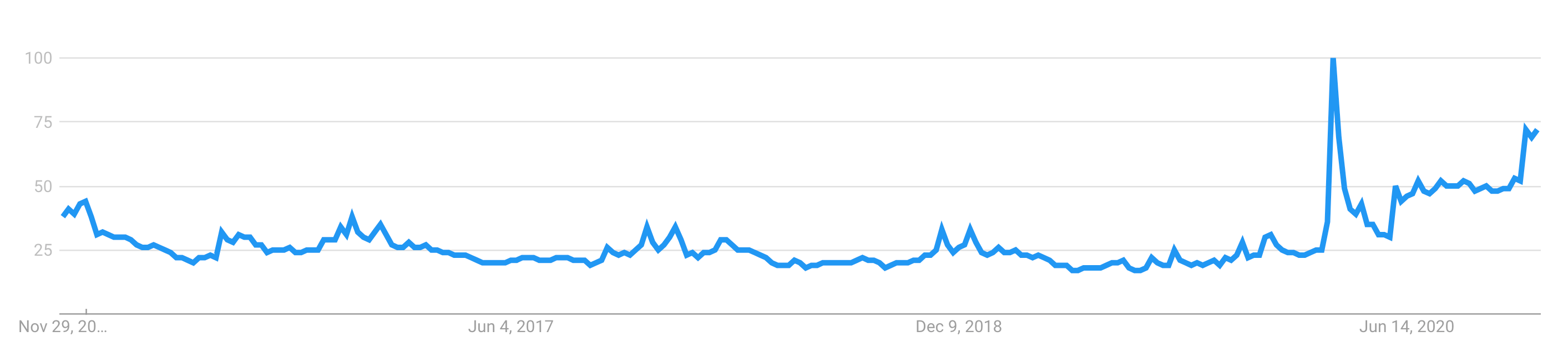 Figure 2 Relative Internet search volumes for “ammo” during the 5 years from December, 2015 to November, 2020. A major spike is seen during the first wave of lockdowns in mid-March, 2020 and following the elections in early November, 2020. (Source: Google Trends).