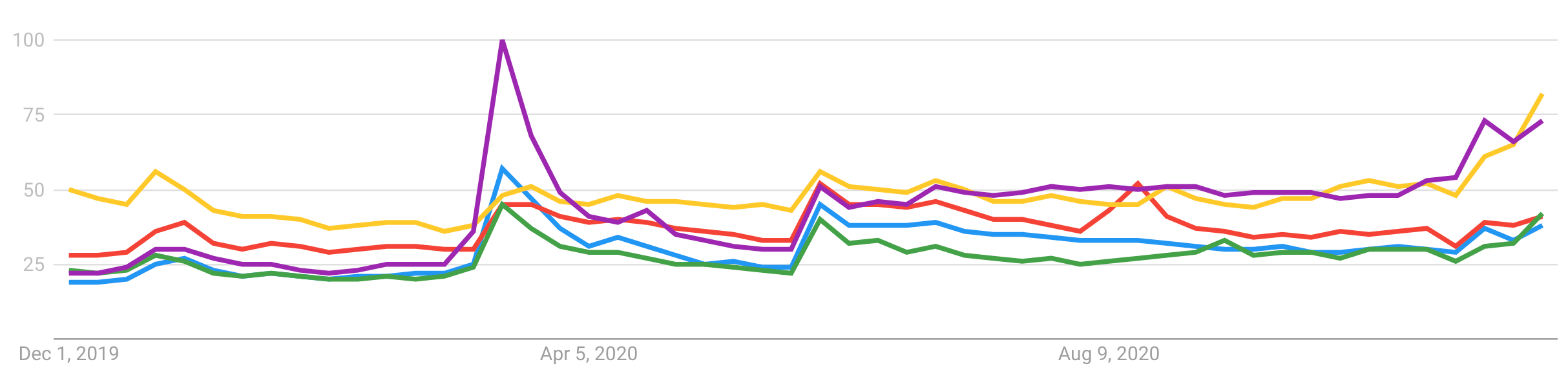 Figure 1 Relative Internet search volumes for gun-related search terms during the 12 months from December, 2019 to November, 2020. Search terms include: “9mm” (blue), “pistol” (red), “rifle” (yellow), “shotgun” (green), and “ammo” (violet). Spikes are seen during the first wave of lockdowns in mid-March, 2020 and following the elections in early November, 2020. (Source: Google Trends).