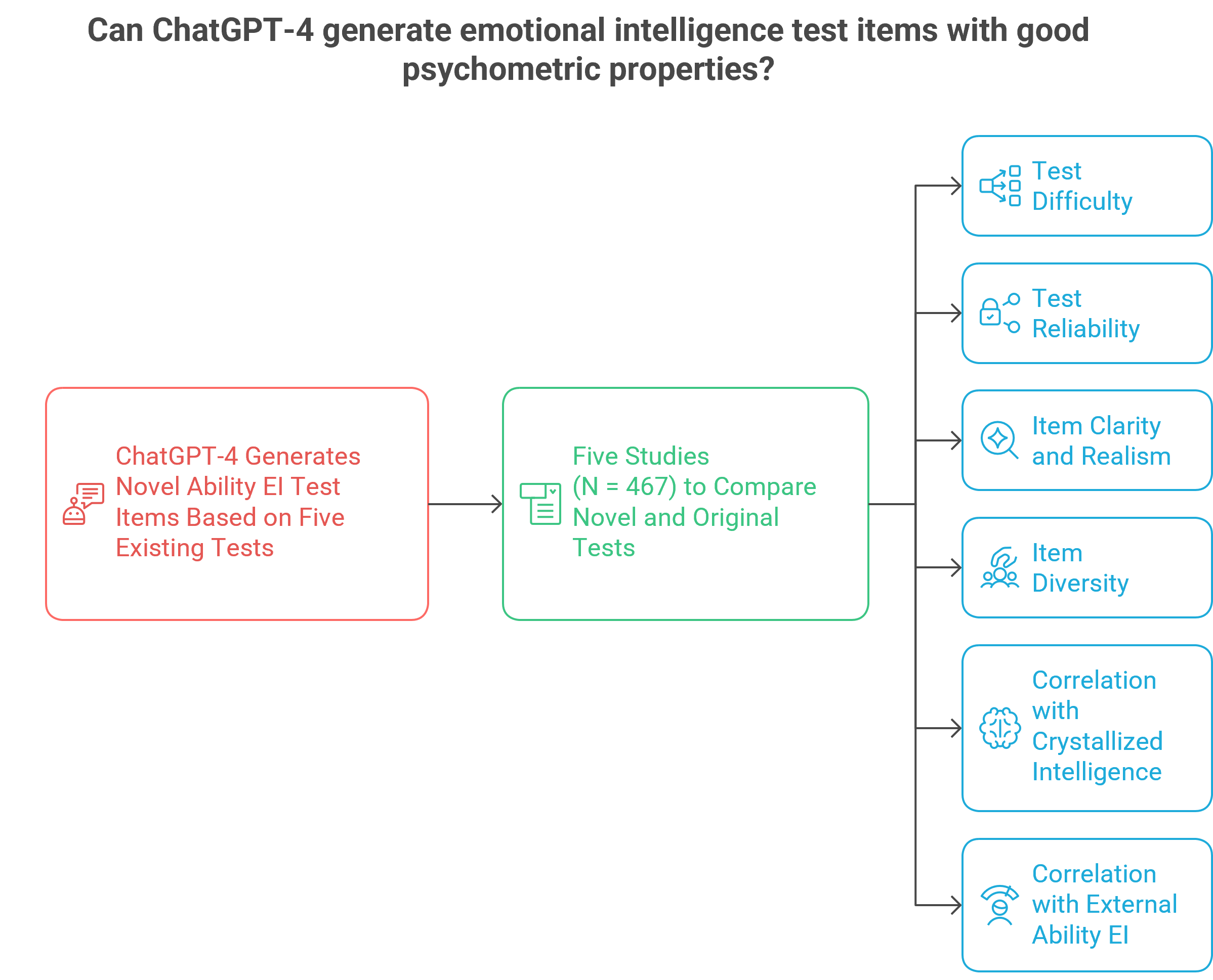 In the second phase, we took the project one step further. We asked ChatGPT-4 to generate entirely new EI test items, which we then administered to 467 participants across five studies. Each participant completed one original test (e.g., the STEU), one ChatGPT-generated version of that test, a vocabulary test (to measure crystallized intelligence), and an additional EI test to assess construct validity. Participants also rated both test versions for clarity, realism, and item diversity (see Fig. 3).