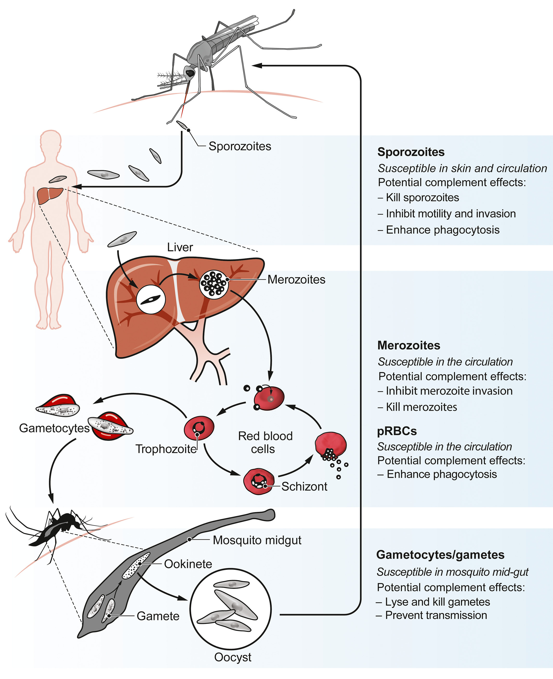 Figure: Plasmodium life cycle and opportunities for antibody‐complement attack. (Image taken from Kurtovic L, et al, Immunological Reviews 2019 and Beeson JG et al, Science Translational Medicine 2019)