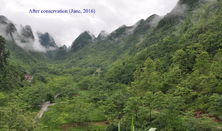 The human population is increasing rapidly, and the continued growth is expected in the future. It is thus inevitable that marginal lands are being populated and controlled by management. Natural vegetation is globally transformed to a human controlled environment and there is no way to stop the encroachment of settlements. Here, only a suitable management of natural resources can ensure a sustainable development for the long term. The Chinese karst region is a very fragile ecosystem in which population pressure and overuse of natural resources have led to widespread desertification over the past century. The expansion of croplands to sloping hills has accelerated soil erosion leading to a loss of ecosystem services and increasing poverty of the local population. Since the end of the 1990s, the Chinese government has launched the largest conservation projects in human history. These “mega-projects” include afforestation and reforestation activities planting millions of trees and converting farmland on sloping hills into forests. Moreover, large forested areas have been protected and it is no longer allowed to collect firewood.