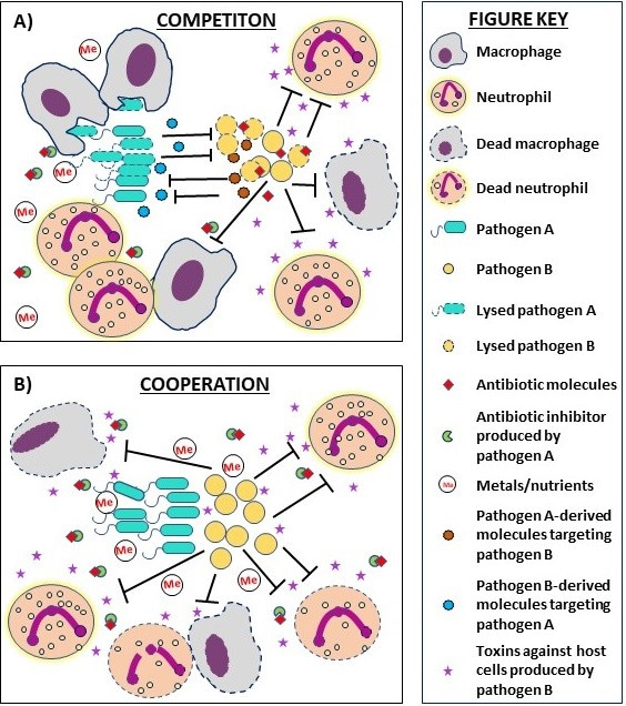Recently, microbiologists have been making attempts to mimic more realistic scenarios by studying microbial communities containing multiple species 1. These studies have revealed the importance of microbial interactions in driving the physiological responses of microbes. In fact, these co-culture studies have revealed that sometimes a microbe requires the presence of a community in order to be able to be grown in a laboratory setting because these “helper microbes” can provide nutrients and/or alleviate stressors for the unculturable microbes 2-4. Therefore, we hypothesized that similar types of cooperation might be happening in our bodies during chronic infections, which are known to contain multiple microbial species. When we surveyed the literature, we were able to find numerous examples in which microorganisms seemed to lose their competitive strategies during infection 5-9 and examples in which microbes seemed to synergize to exacerbate disease 10,11. Due to the harsh nature of sites of infection which includes host-mediated limitation of certain essential nutrients, microbial competition would intuitively be rampant. So, what are the possible reasons that cooperation might evolve in this environment? We hypothesize that cooperative interactions can reduce individual biosynthesis cost by promoting a division of labor for resource production and potentially increase virulence of the pathogens as a community by enabling neighboring microbes to exploit the unique suite of defensive molecules that each microbe possesses for survival in the presence of an active immune response (as shown in the figure). The evolutionary race of pathogenic microbes against host defense strategies might play a role in unifying competing microbial species and rendering them resistant and more virulent as a community than as individual species.