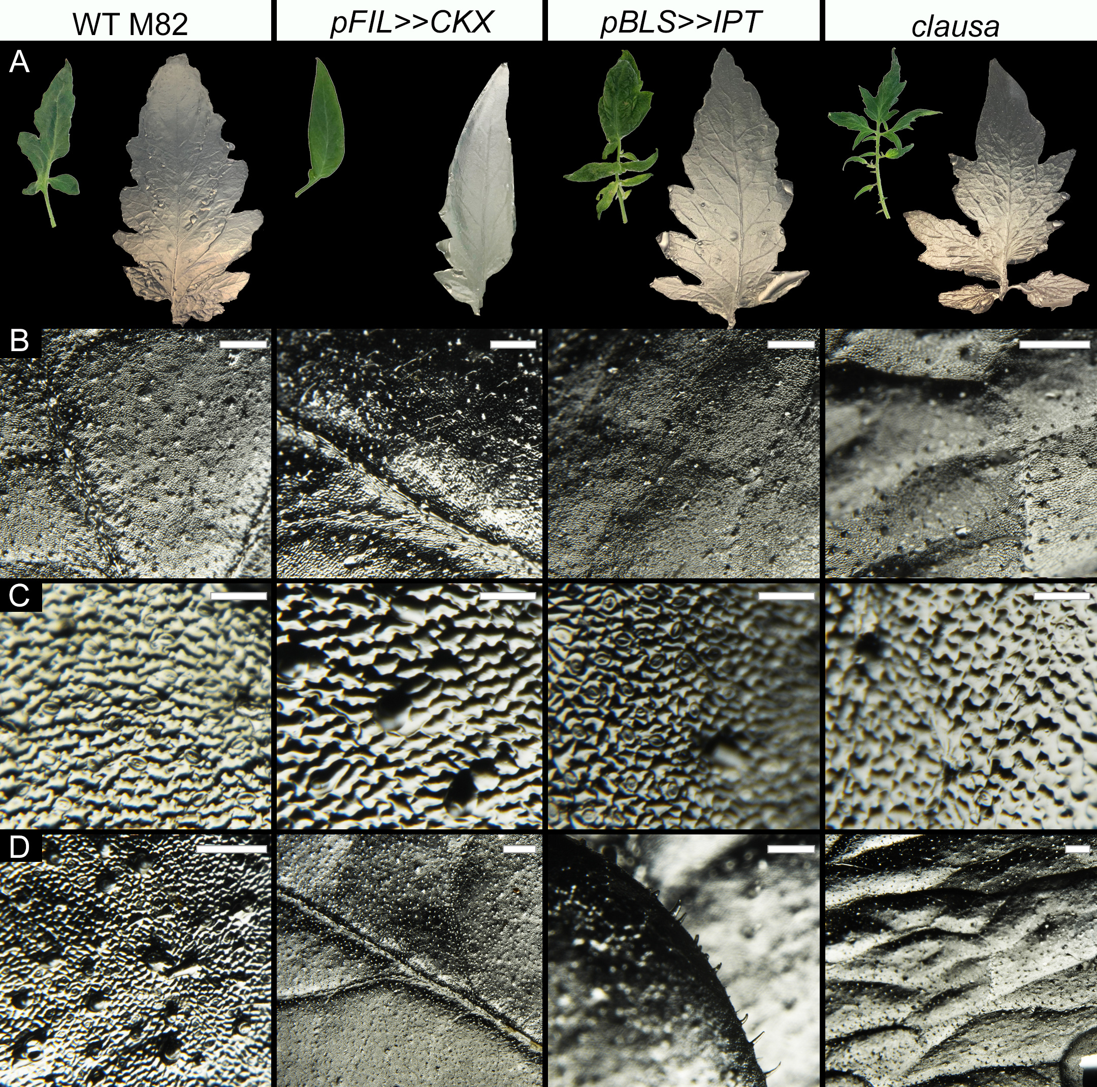 Fig 5. Leaf structural features captured in PDMS replicas. Light microscopy images of positive agar (A) and PDMS (B-D) replicas of leaves from the indicated genotypes. (A) Positive agar replicas alongside the natural leaf for reference. (B) Leaf adaxial topography including veins, bars= 500µM. (C) Recapitulation of leaf epidermal structure, including stomata, bars= 100 µM. (D) "Special" features are preserved in PDMS- placement of trichomes (M82), veins (pFIL>>CKX), trichomes (pBLS>>IPT), rugose topography (clausa). Bars= 500 µM, except in M82 where bar= 250 µM.
