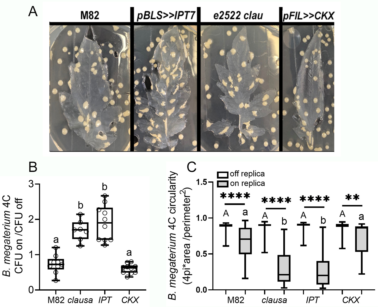 Fig 6. Bacilli exhibit preference for synthetic leaf structures derived from High CK genotypes, and show decreased circularity on these structures. (A) Images depicting the colony morphology of B. megaterium 4C growing on the different genotype- derived synthetic leaf structures. (B) B. megaterium (OD600=0.01) was spray inoculated onto agar replicas of leaves of the indicated genotypes. Bacterial growth was quantified after 24 h. Preference or aversion to the leaf structure was assessed by quantifying the colony forming units (CFU) growing on the leaf structure, and dividing it by the CFU growing on an equal area in the surrounding structure-less agar. (C) Colony circularity was measured after 24 h using ImageJ.