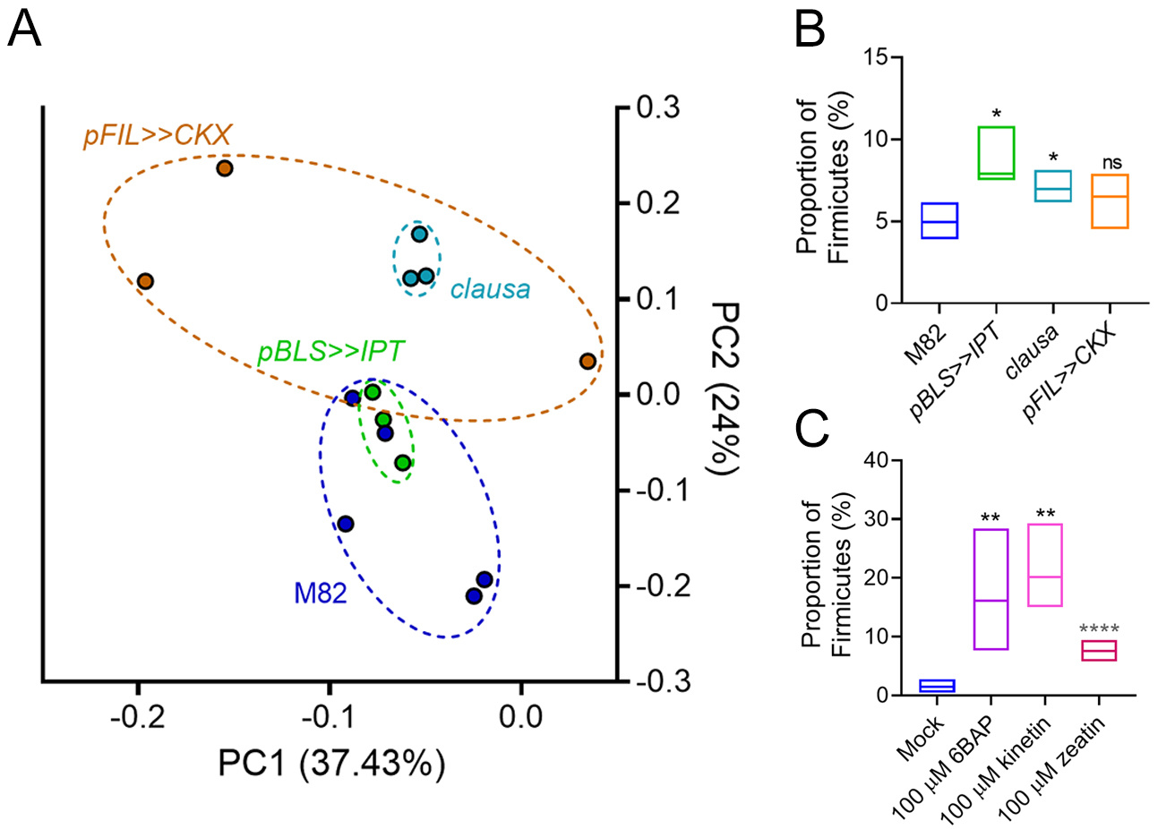 Fig 2: CK drives microbial content in the phyllosphere. The clustering of samples according to CK content in the genotype is much higher in High CK (pBLS>>IPT) or increased CK sensitivity (clausa) than in the background line (M82) or under low CK (pFIL>>CKX) (A). High CK genotypes (B) or exogenous CK treatment with three different CK derivatives (C) promote firmicutes, mostly bacilli, in the phyllosphere