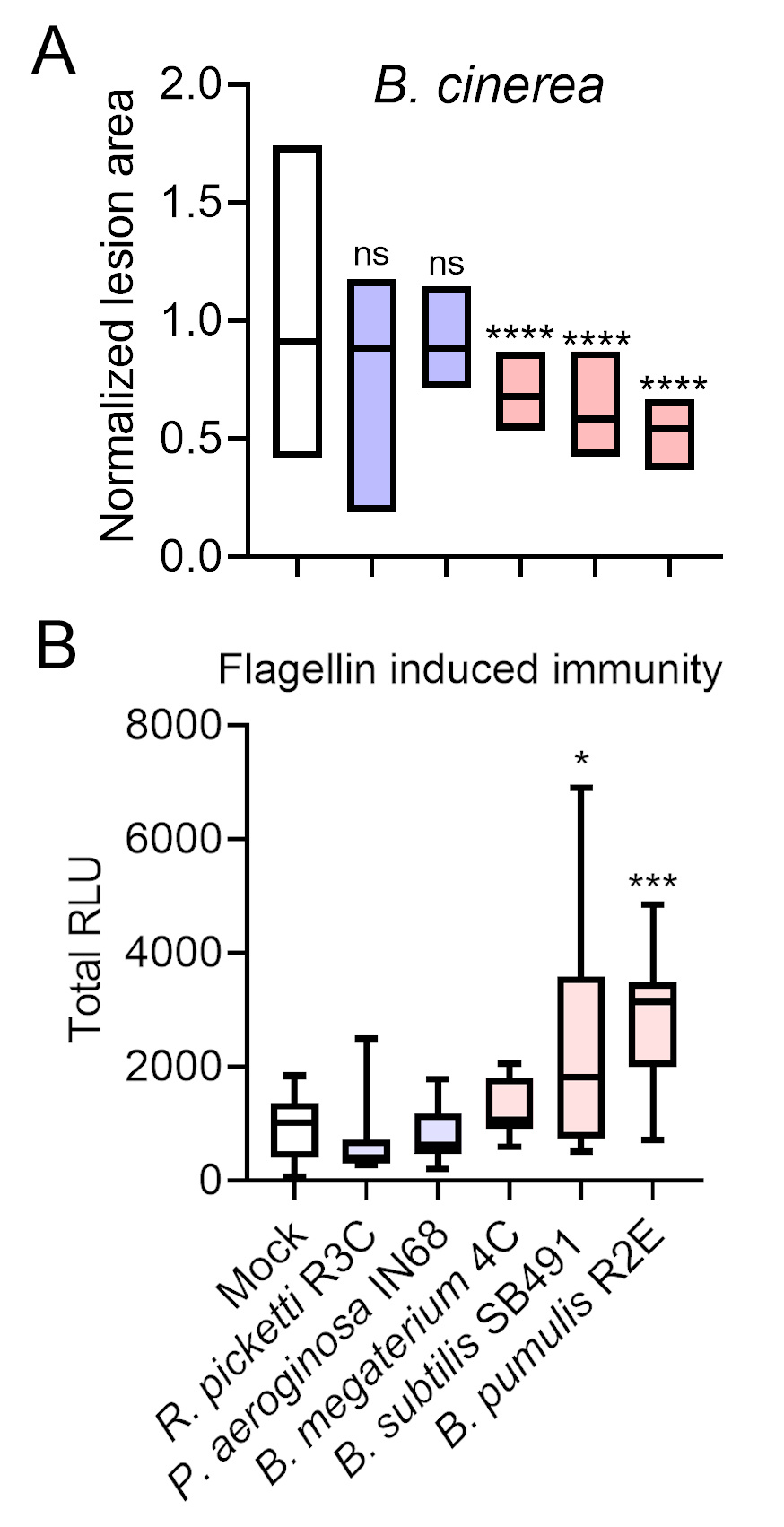 Fig 3: Phyllosphere bacilli isolates from high CK genotypes promote disease resistance, exemplified here by lesion area in response to the gray mold pathogen B. cinerea, and immunity, exemplified here by the reactive oxygen species generated in response to the bacterial elicitor flg22. Gram positive bacilli isolates are indicated in red, and gram negative control bacteria, in blue