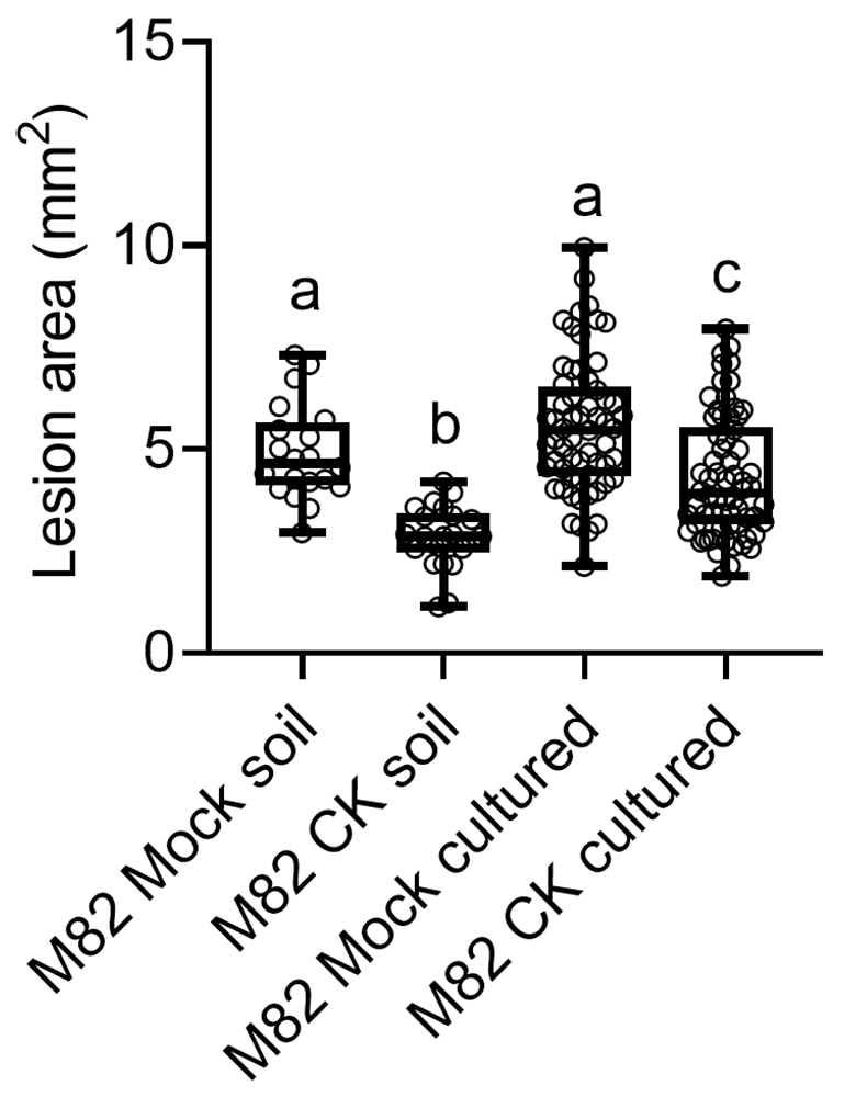 Fig 4: CK mediated disease resistance depends on the microbiome. Gray mold disease levels are similar in Mock conditions in soil or cultured M82 plants, however, disease reduction mediated by CK treatment is significantly smaller under sterile conditions, leading to an increase in lesion areas upon CK treatment in sterile, cultured conditions, when compared with CK treatment under non cultured conditions.