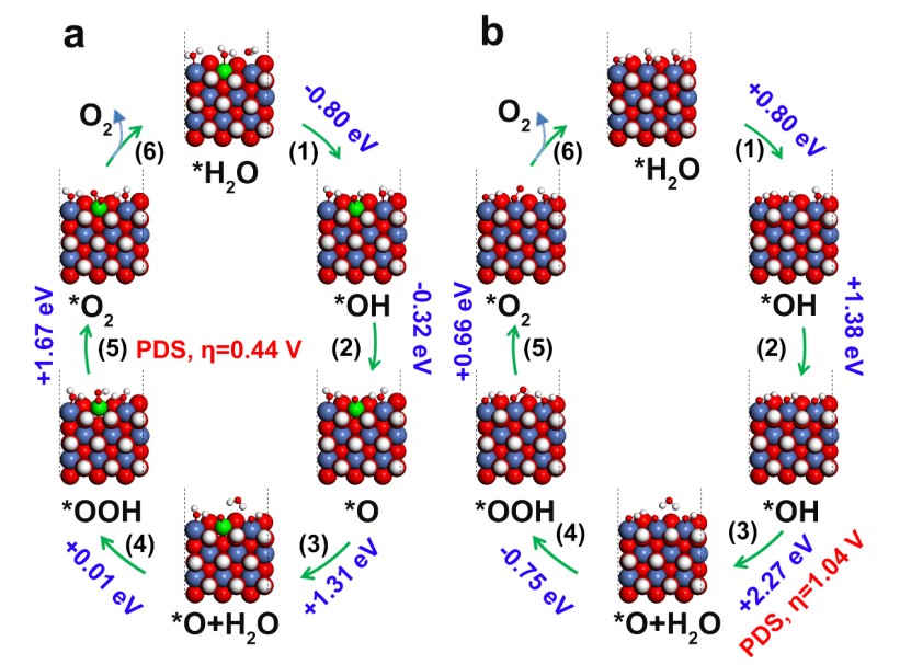 Figure 2. Mechanism of OER on (a) W-doped Ni(OH)2 and (b) bare Ni(OH)2catalyst based on DFT calculations, in which red, white, green and blue atoms represent the oxygen, hydrogen, nickel and tungsten atoms, respectively.