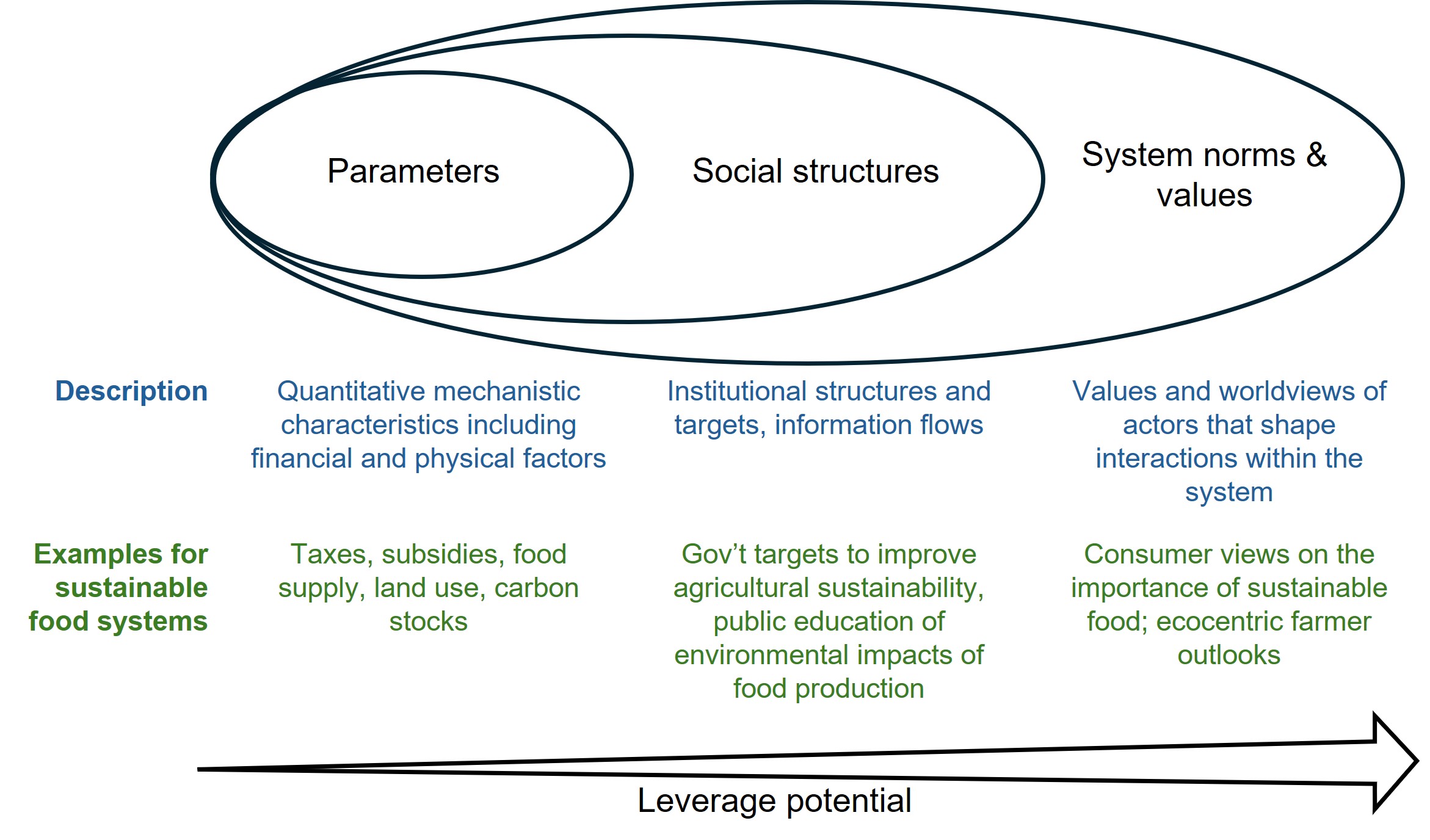 Back in the 1990s, a pioneering sustainability scientist, Donella Meadows, realised that many efforts to improve sustainability focus on obvious and tangible areas of intervention which, although well intentioned, bring about limited change and don’t address the root causes of unsustainability. Instead, deeper ‘leverage points’, associated with system norms, values and mindsets, could have the greatest potential to enable transformative change (Figure 1). This concept has gained much traction in sustainability science, notably through Dave Abson’s work, but is largely unexplored in food systems. Hence, we applied the ‘leverage points’ approach to the organic sector in the UK, in order to understand how to promote sustainable food production and consumption.