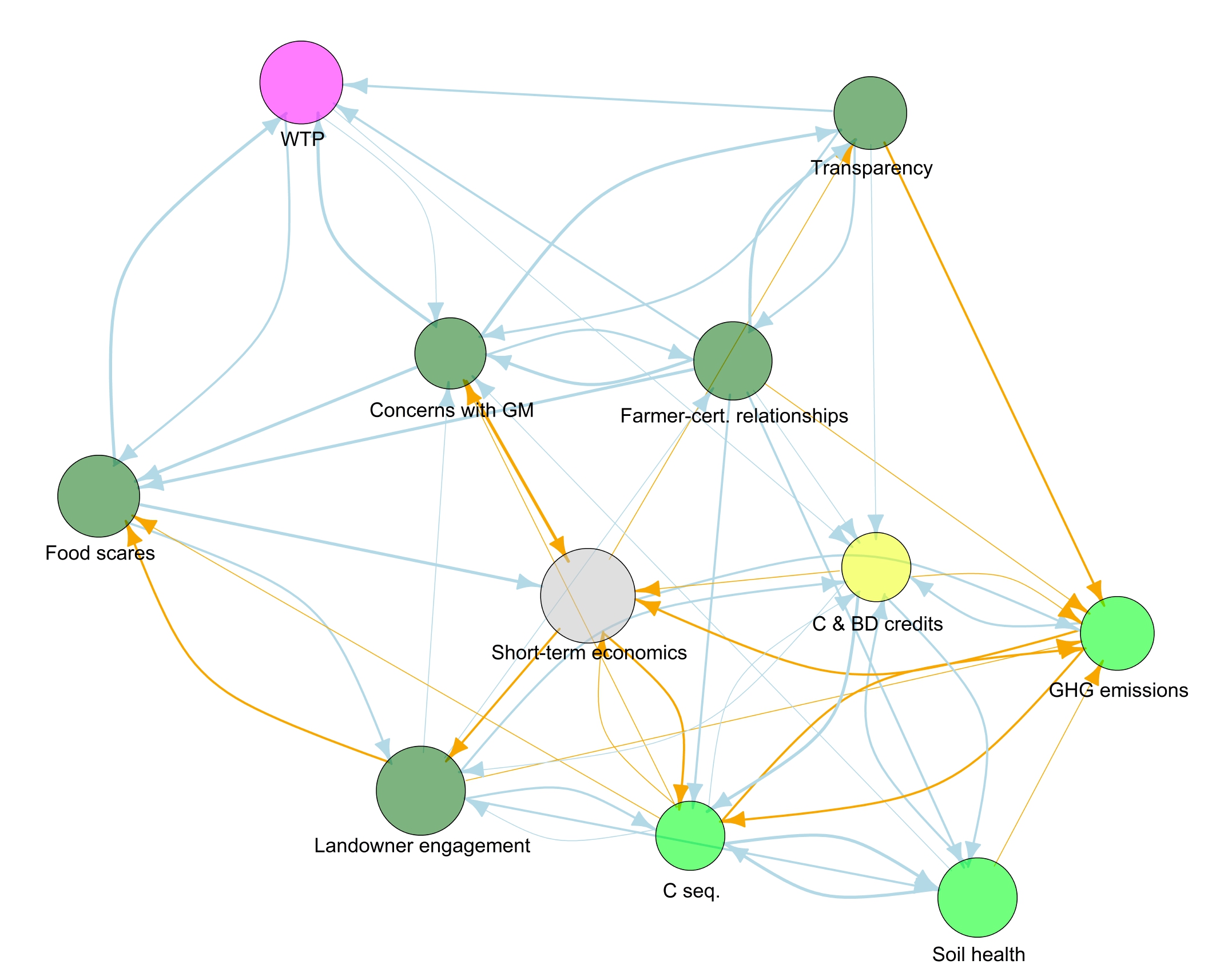 Once we had produced the mental model, we could look at which factors were the most influential in affecting the whole system, i.e. deep leverage points. The most influential factor was ‘short-term thinking in economics’. By this, the experts meant that currently, as a society, our mindsets tend to be focussed on short-term economic profit, often at the expense of long‑term sustainability. Landowner engagement with organic farming was the second highest influential factor, again suggesting that the system is highly influenced by behavioural norms and mindsets – backing up Donella Meadows’ leverage points theory.