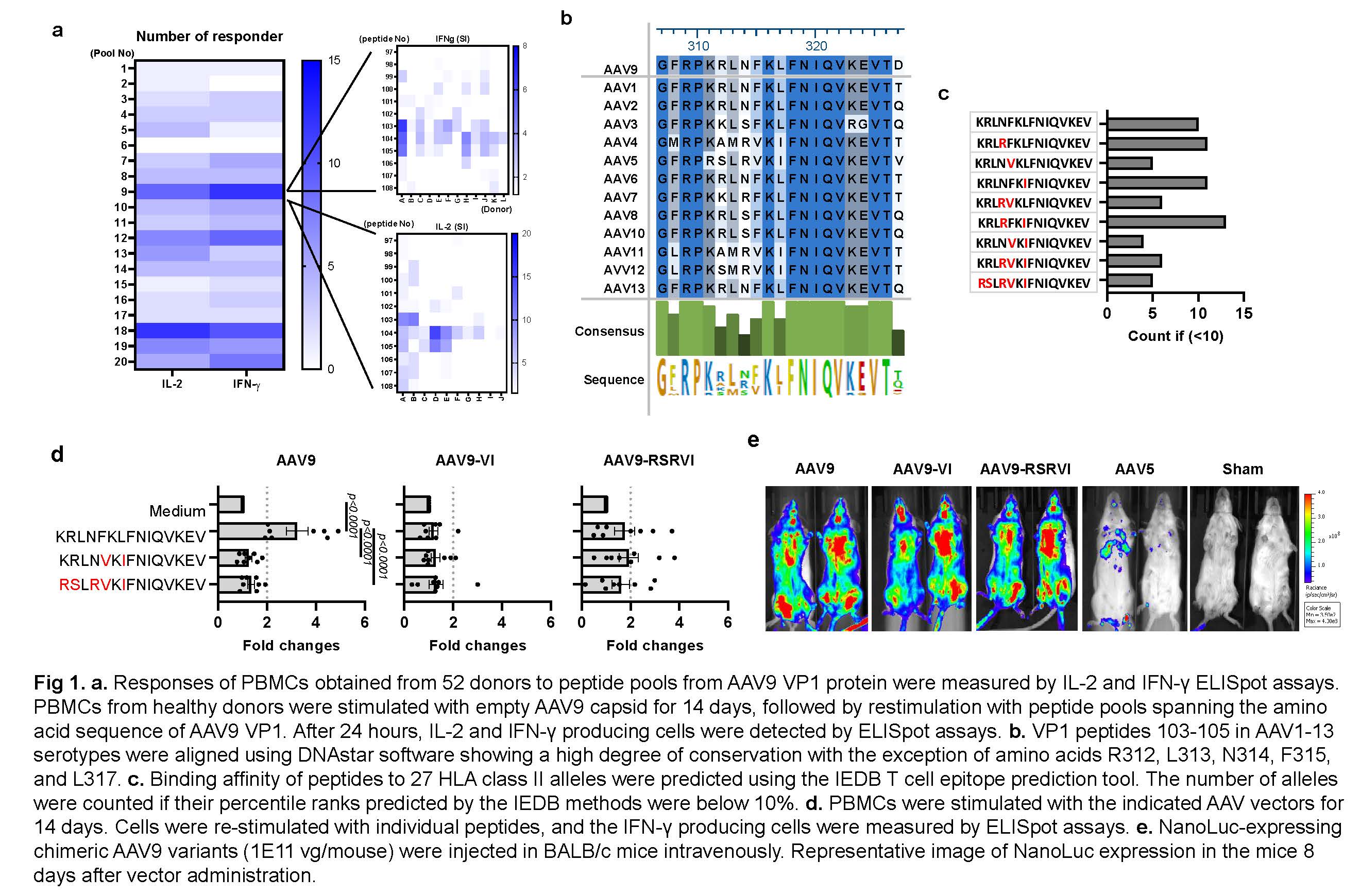 Immunodominance is a phenomenon in which T cell responses are restricted to a small number of peptide epitopes derived from a small set of antigenic precursors. In this study, we successfully identified T-cell-reactive epitopes in the AAV9 capsid (Fig 1a), including one promiscuous and immunodominant epitope that is highly conserved within most natural AAV serotypes (Fig 1b). The immunodominant epitope in AAV9 was identified between amino acids 307 and 327 and immune response to this epitope was found in 23% (12 of 52) of donor samples. In addition, this epitope is not located on the surface of the AAV9 capsid and is recognized by CD4 T cells through HLA-DP presentation. The binding of this epitope was also predicted using the Immune Epitope Database’s (IEDB) binding algorithms and confirmed that the epitope 307-327 is HLA-DP restricted and promiscuous.