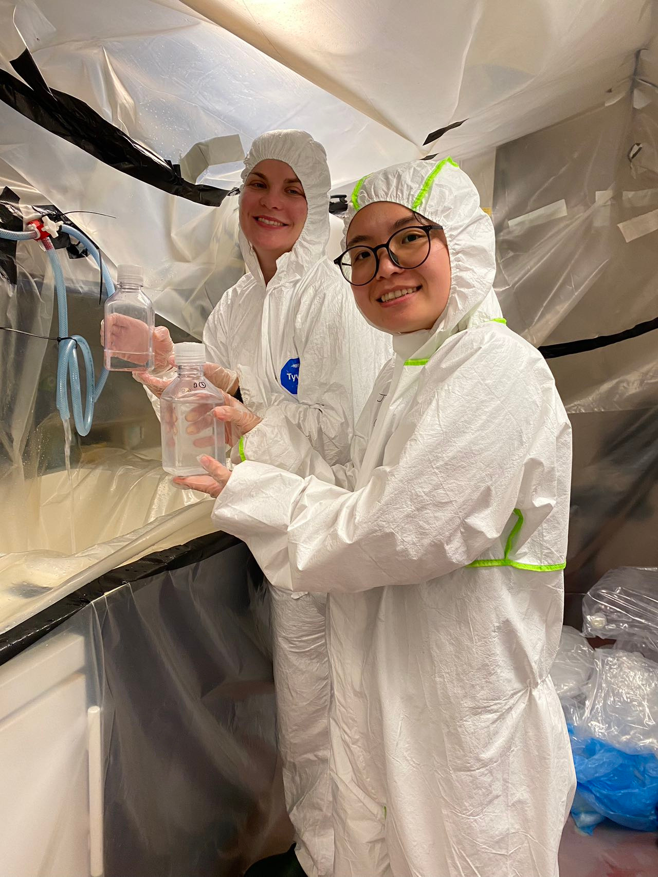 (Jiaying Guo (right) and colleague Anne working in the clean tent, known as the “bubble”.)