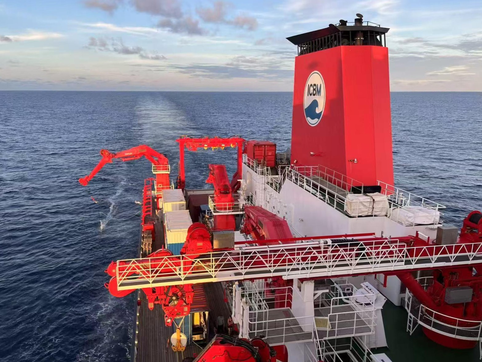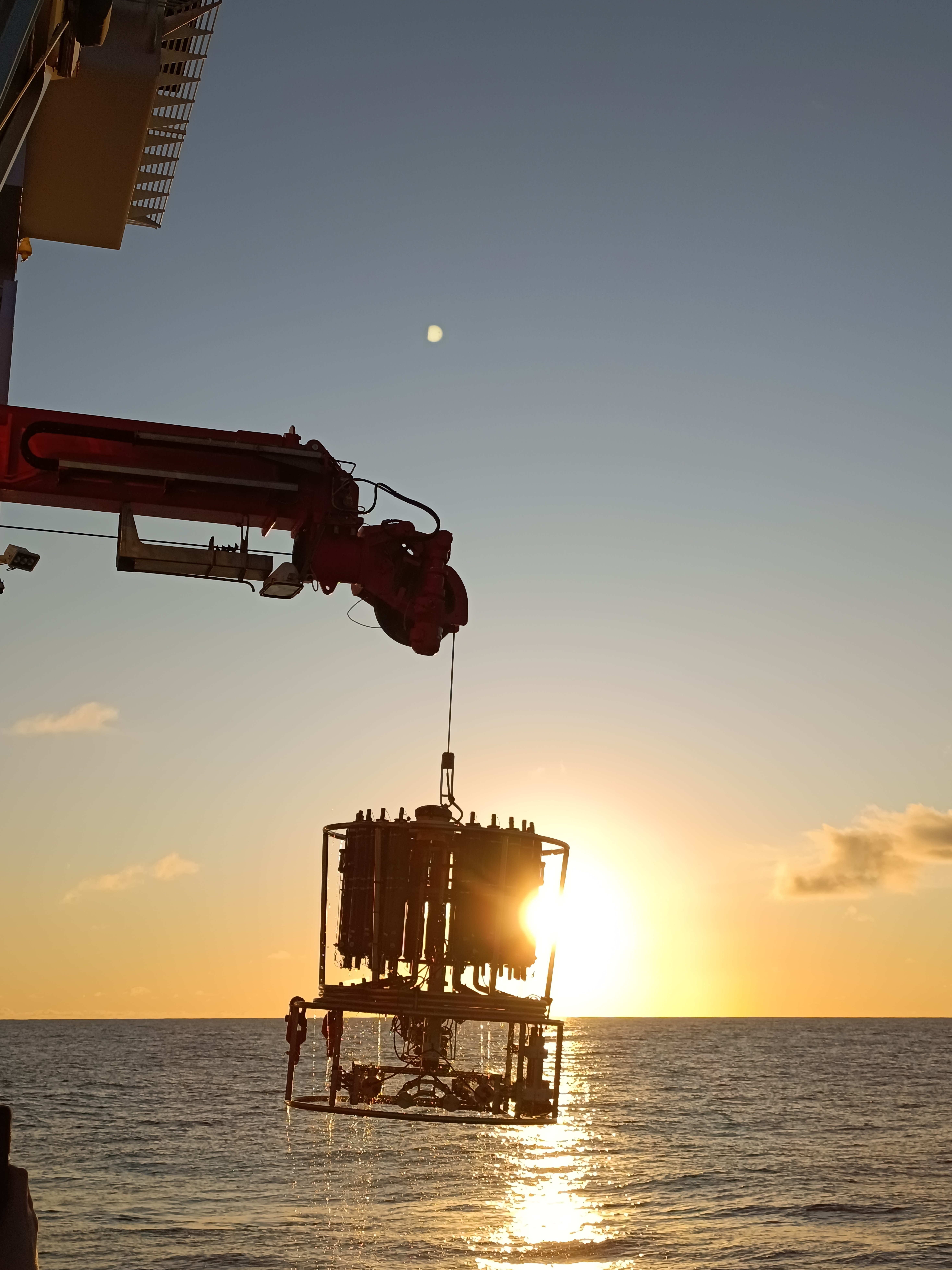 (CTD deployment at sunrise during the RV Sonne expedition. Photo credit: Xuegang Chen.)