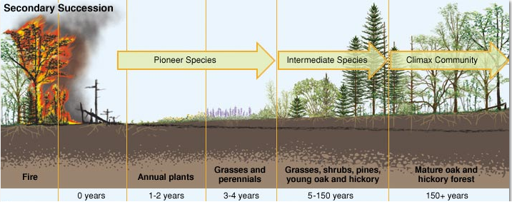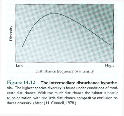 Diversity is often associated with the functional stability of ecological communities from microbes to macroorganisms. Understanding how diversity responds to environmental perturbations and the consequences of this relationship for ecosystem function are thus central challenges in ecology. The Intermediate Disturbance Hypothesis (IDH) predicts a peaked relationship between diversity and disturbance (Connell, 1978; Sousa, 1979) and has been an important theoretical foundation for understanding diversity-disturbance relationships (DDRs) in ecological systems. The original mechanism proposed for the IDH was the intermittent resetting of ecological succession in forests and coral reefs (e.g. see above image). Disturbances were shown to promote the co-existence of early and late-successional organisms due to competition-colonization tradeoffs. Despite the success of this theory in explaining patterns of diversity in certain systems (Shiel and Burslem, 2013), the IDH has been supported by fewer than half of all empirical studies (Mackey and Currie, 2001), leading to a call for its outright rejection (Fox, 2013).
