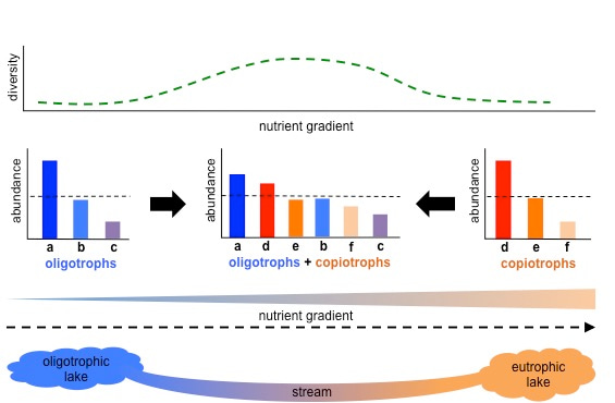In summary, we developed a controlled experimental system for testing the DDRs in the laboratory. We found support for peaked DDRs, but also identified how these DDRs can be transient due to ecological feedbacks. Based on our results, we define unimodal DDRs as non-equilibrium mixtures of incompatible ecological states defined by fitness tradeoffs along an environmental gradient (e.g. see above image), maintained by disturbance-induced environmental heterogeneity. Whether or not the IDH is considered a valid theory (Fox, 2013), we hope our results shed some light on why discrepancies can arise between DDR theory and empirical results. Moving forward, we hope other research groups will perform similar studies in other systems to assess the generality of our results. From the use of antibiotics in the mammalian gut to the eutrophication of freshwater lakes, having reliable models for how community diversity responds to disturbance will inform our ability to predict the behavior of ecological systems in the presence of perturbations.