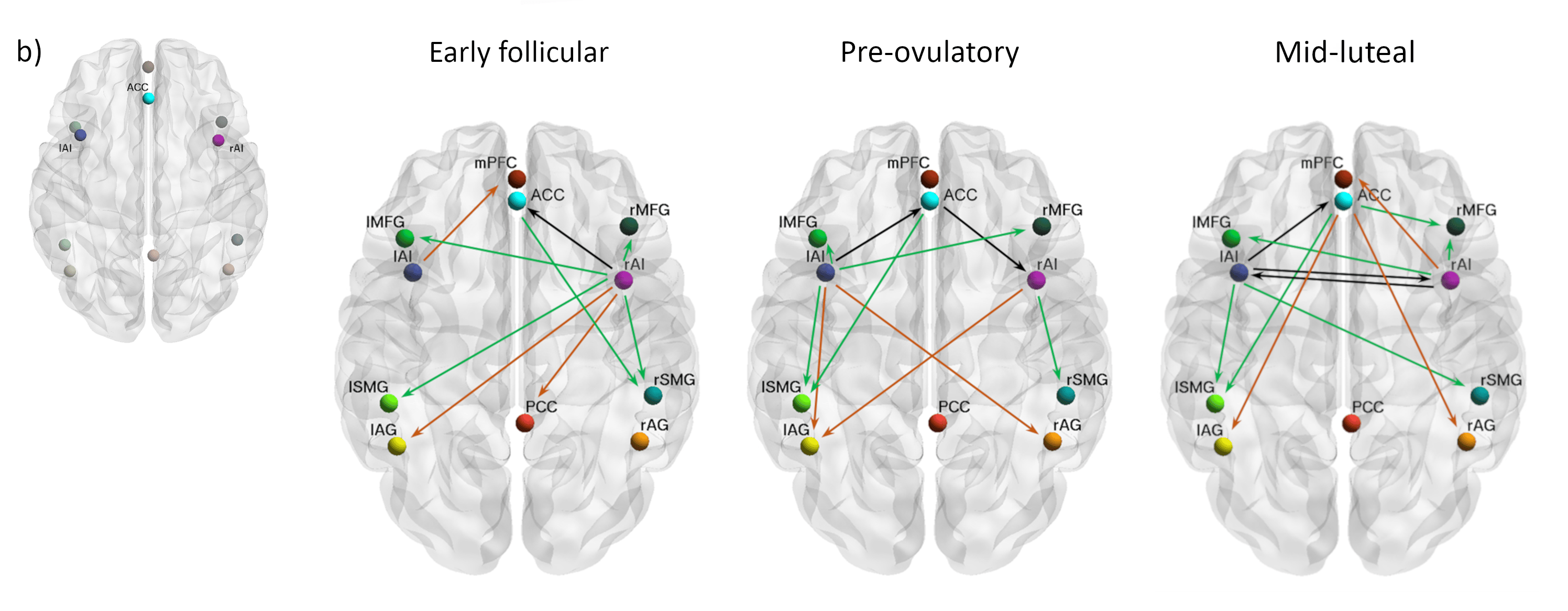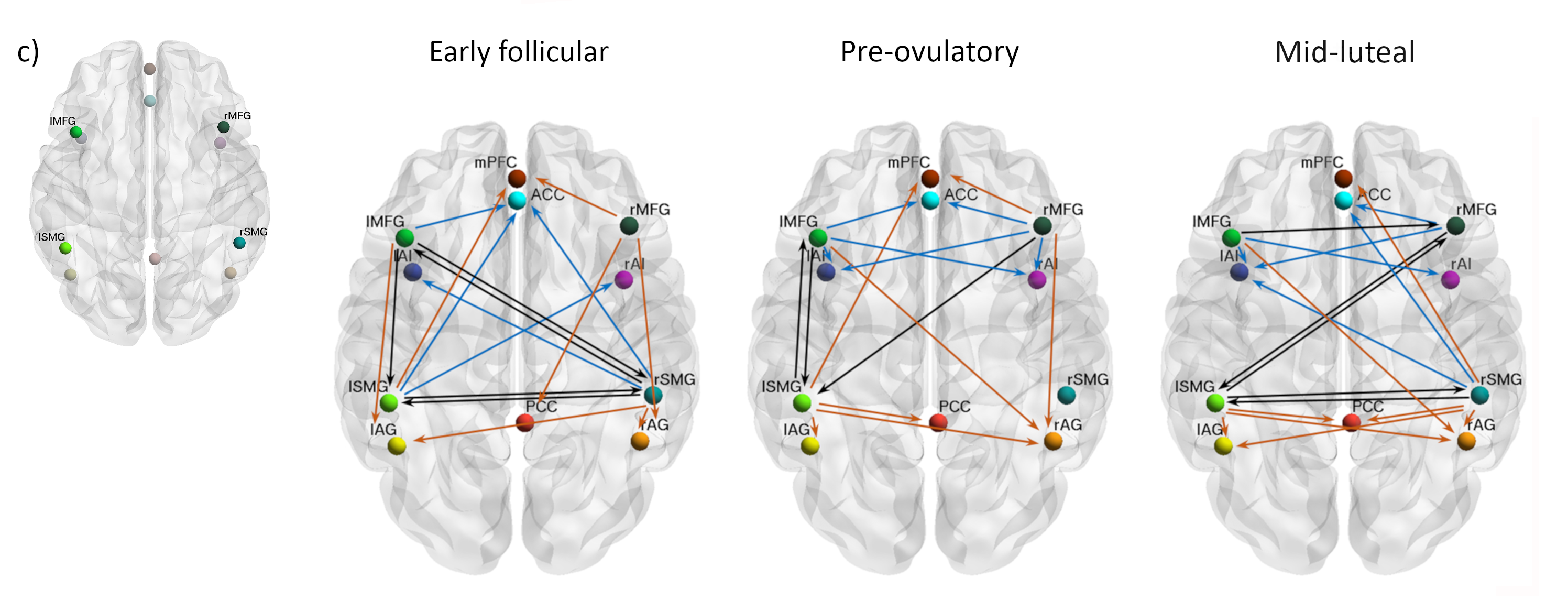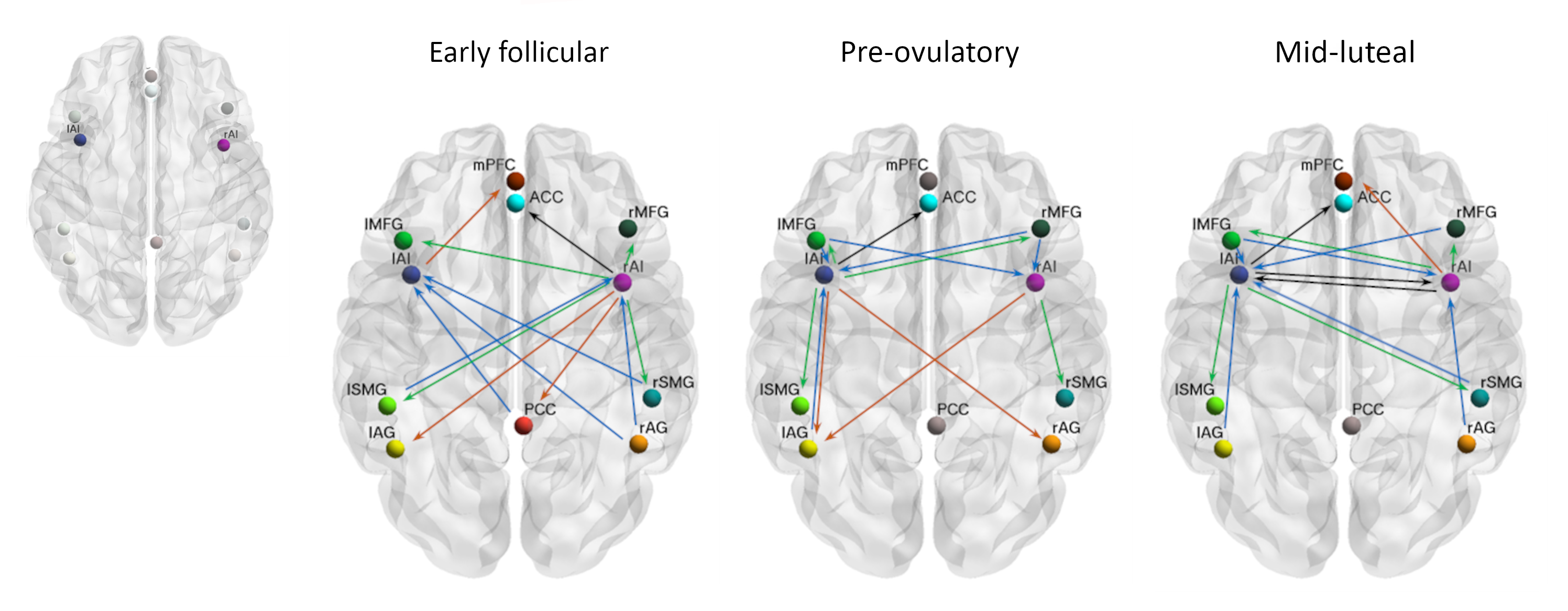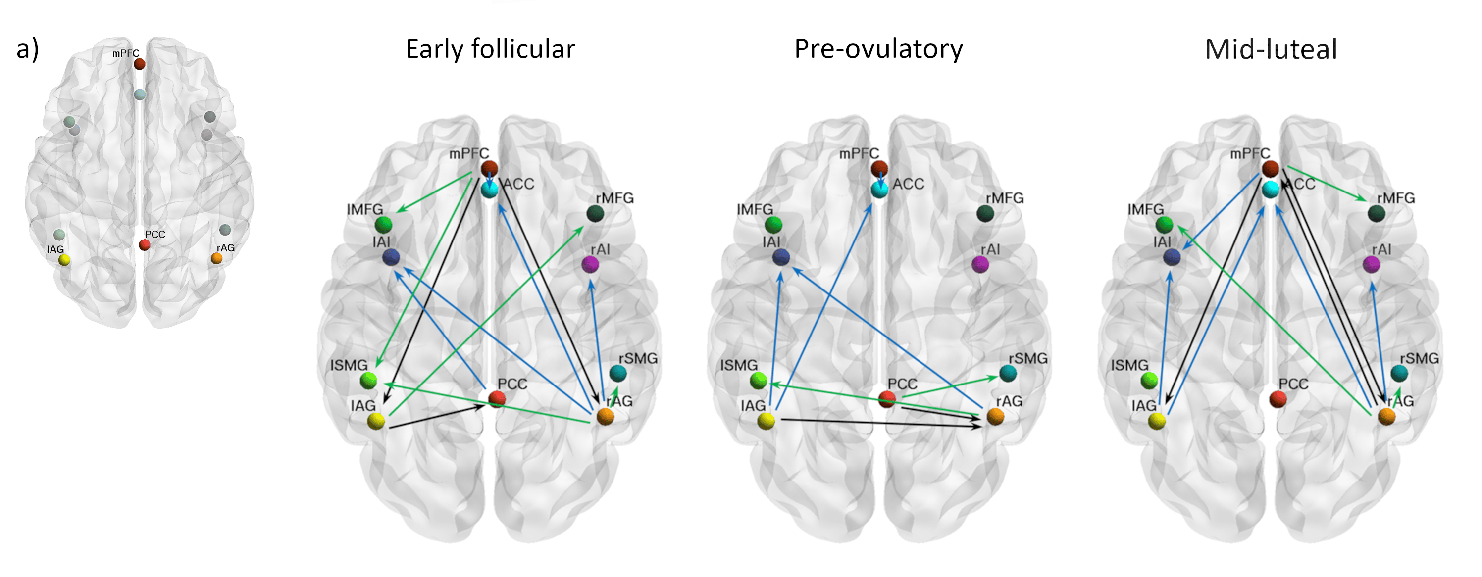 In our paper “Spectral dynamic causal modelling in healthy women reveals brain connectivity changes along the menstrual cycle” published in Communications Biology https://rdcu.be/ct03P, we applied state-of-the-art connectivity analyses within a triple network model to a large longitudinal resting state-fMRI dataset. This way, we investigated for the first time the causal influence within and between the core networks in 58 healthy young women during early follicular, pre-ovulatory and mid-luteal phase. We selected 11 brain areas representing the three neurocognitive networks and assessed the influence that each of them exerted over the others (effective connectivity) by computing spectral dynamic causal models (DCMs) within a Parametric Empirical Bayes (PEB) framework10.