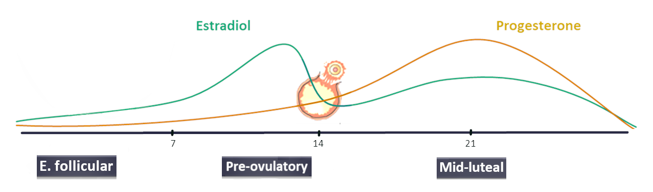 The purpose of the female reproductive cycle, in humans: menstrual cycle, is to trigger ovulation by complex neuroendocrine feedback loops. Accordingly, the ovarian hormones, estradiol and progesterone, fluctuate along the menstrual cycle. However, besides their key role in reproduction, these hormones have far-reaching neuroactive effects1. Currently, the influence of ovarian hormones on brain development and organization is broadly evidenced by animal research, ranging from local stimulation of new brain cells (neurogenesis) to the modulation of large-scale brain networks. As a result, even fluctuations in cognitive processes have been observed2,3. Paradoxically, what should be a compelling reason to explore the hormone-related neural changes in humans, is used as deterrence against it, and women’s brains remain under-investigated4. As a result, we are now facing a serious sex bias in neuroscientific research. Longitudinal designs along the menstrual cycle are more challenging to handle, but also necessary to understand the role of ovarian hormones as modulators of brain function. Indeed, this natural within-subject setup offers the perfect scenario to study three characteristic hormonal profiles in women: low hormonal levels during the early follicular phase at the beginning of the cycle, an estradiol peak while progesterone remains low right before ovulation in the middle of the cycle, and higher levels of both hormones during the mid-luteal phase about a week after ovulation (Fig.1).