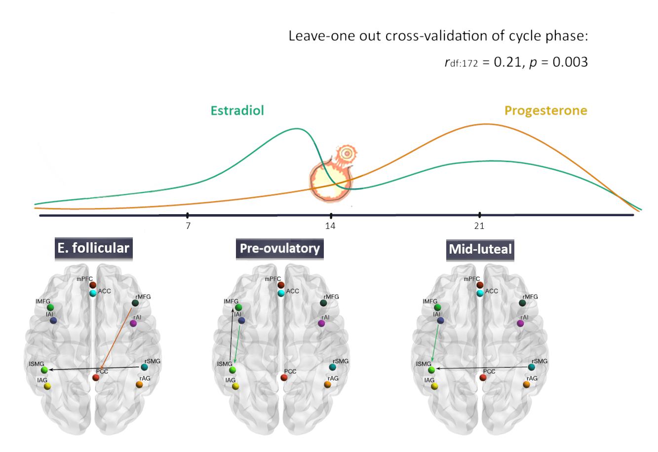 Future studies combining structural and functional changes together and considering any relevant inter-individual variables may offer more accurate classifications. Most importantly, these significant results corroborate the remarkable plasticity of the female brain in response to the rapid changes of ovarian hormone levels across the menstrual cycle. This is particularly noteworthy considering that the hormonal fluctuations along the menstrual cycle are comparatively subtle as opposed to more pronounced hormonal changes during pregnancy, adolescence or menopause. Our results on healthy naturally cycling women may have further implications for those menstrual cycle-related disorders where this pattern of brain coupling dynamics has been suggested to be impaired, such as PMS, PMDD or dysmenorrhoea15. This highlights the importance of studying physiological ovarian hormone modulations, especially when women’s health and well-being are in question.