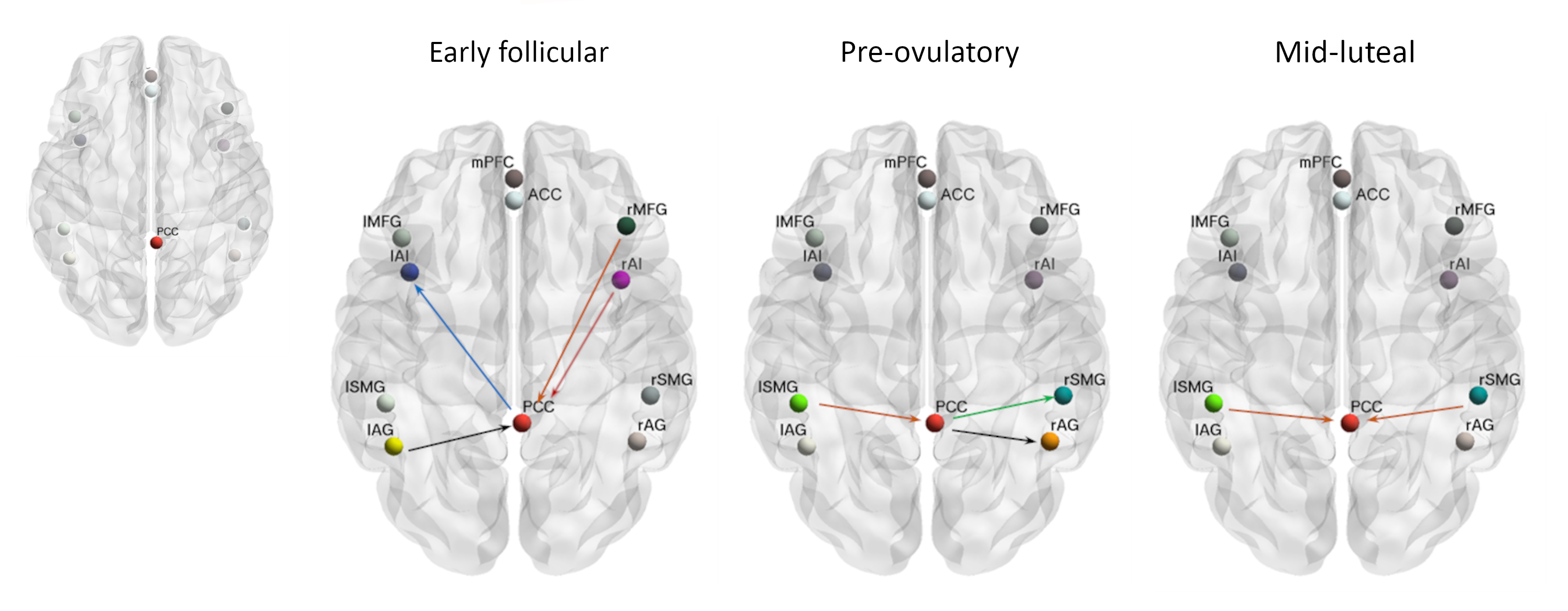 Regarding the connectivity from the ECN, we also observed a decreased asymmetry during the mid-luteal phase (Fig. 2 c). This phenomenon has already been suggested to reflect a reduced transcallosal inhibition related to increased levels of progesterone11.