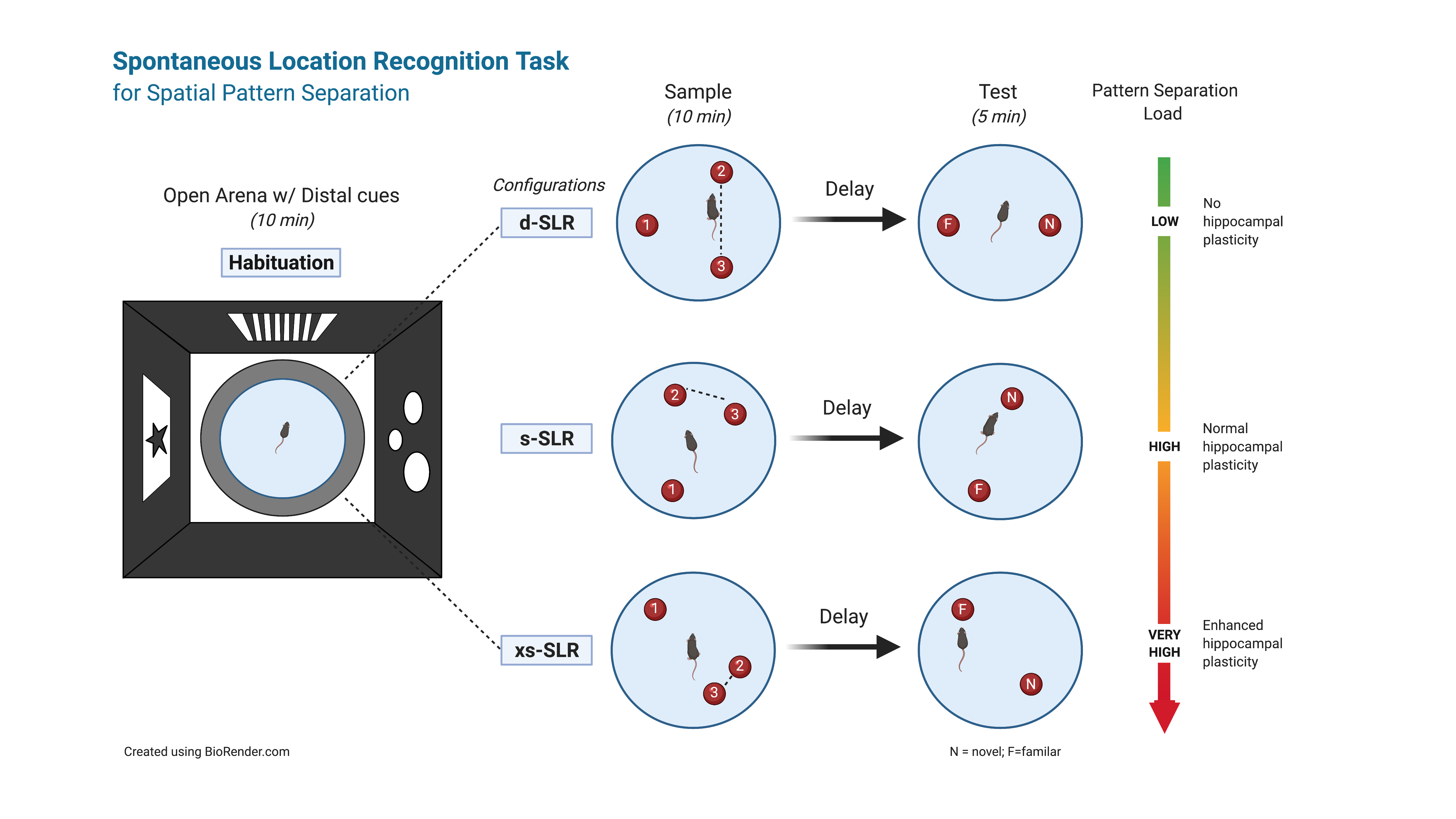 In the sample phase, animals explore an area and encode the locations of three identical objects oriented in a triangular configuration. In the test phase, animals return to the arena that now contains one object in a novel location, equidistant between two previous locations, while another object remains in a familiar location.