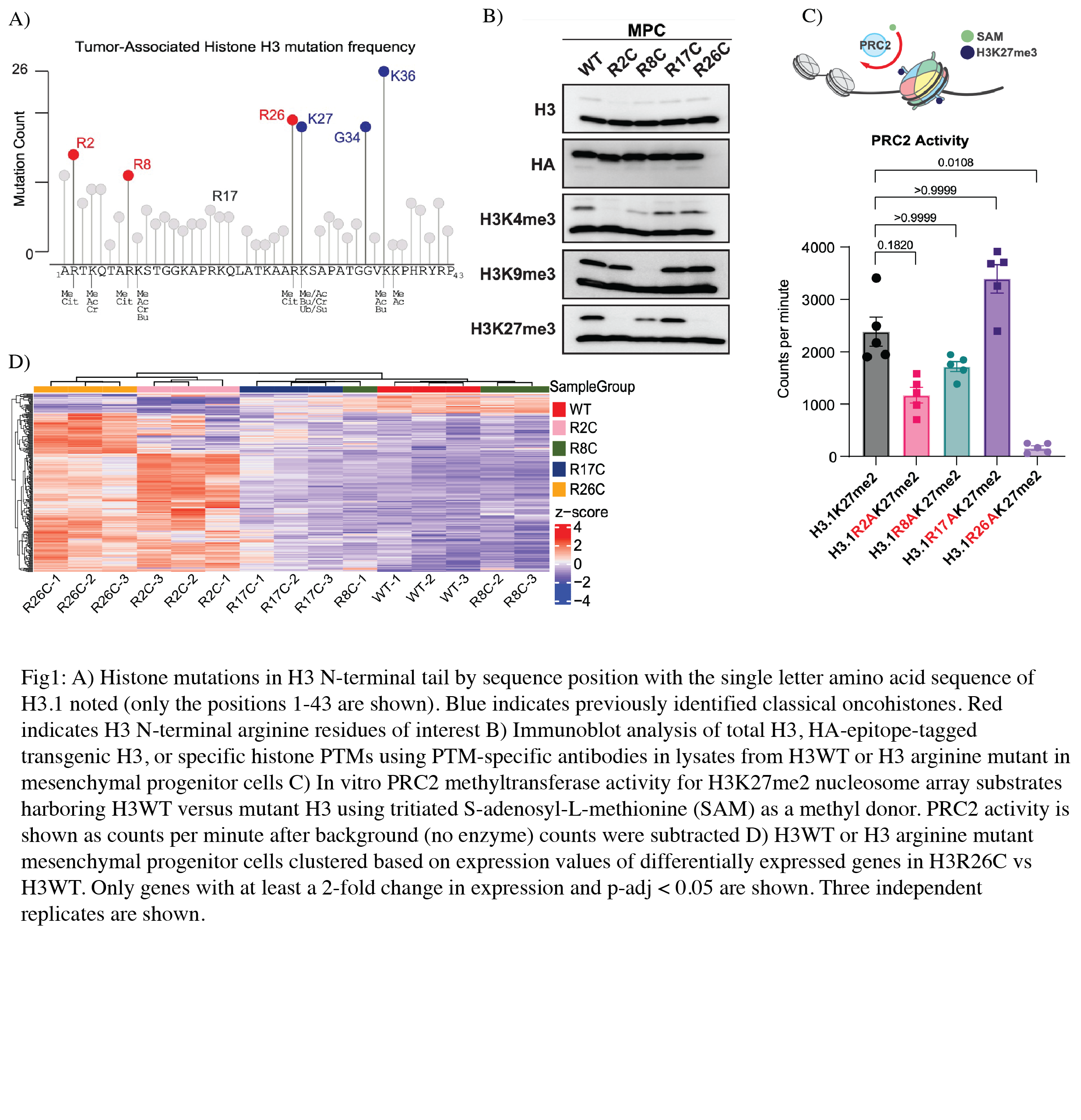 We were motivated to understand how a newly discovered class of cancer associated recurrent histone mutations in arginine residues of H3 N-terminal tail (H3R mutations) function. In our study, we demonstrate that these novel oncohistone mutations perturb the function of a ‘writer’ methyltransferase Polycomb Repressive Complex 2 (PRC2), disrupt the histone methylation landscape, and promote aberrant differentiation. Mutations in arginine residues in H3 are prevalent across different cancer types with rates similar to that of previously identified oncohistone mutations (e.g. H3K27M, H3K36M and H3G34V/L) in a pan-cancer cohort (Fig 1A). Mutant R residues lie close to the sites of critical histone modifications and themselves serve as substrates for post-translational modifications, suggesting that H3R mutations might perturb the reading, writing and erasing of key histone marks.