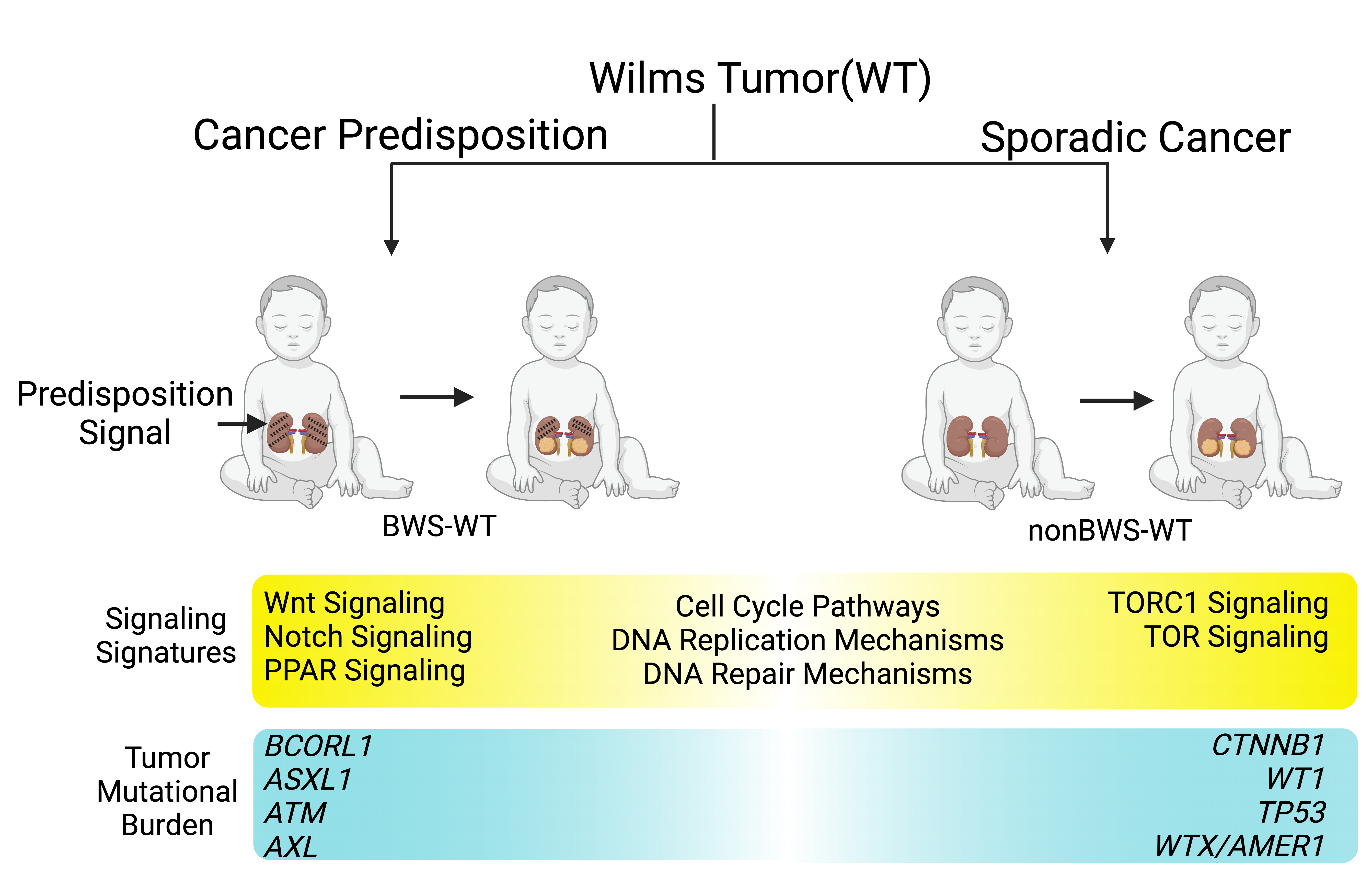 While WT predisposition in BWS is well-established, as are 11p15 methylation alterations in nonBWS-WT, this study is the first to focus on stratifying tumor genomics by 11p15 methylation and BWS status. We have identified pathways unique to BWS-WT and altered-11p15 nonBWS-WT that are differentially regulated by altered methylation gene expression. This observation indicates that altered-11p15 nonBWS-WT and BWS-WT have some common features, but they also have unique gene signatures attributed to the epigenetic predisposition in BWS. WT oncogenesis can be seen as a spectrum of molecular signaling signatures and differential tumor mutational burdens (Figure 1) seen in BWS and nonBWS cohorts. This is the first study that highlights these features of WT oncogenesis based on 11p15 alterations. Further investigation of our findings may serve to identify novel diagnostic or therapeutic targets to combat WT oncogenesis.