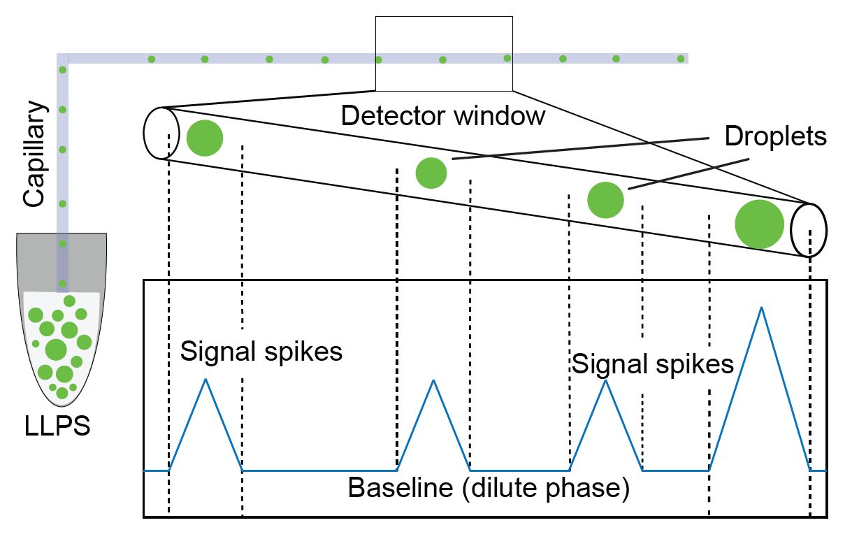 The desired protein is spiked with its fluorescently labeled counterpart (only nM concentrations of the labeled protein is needed) and subsequently phase separated at desired conditions. The initial idea was to distinguish concentrations in both the dilute and dense phase as we assumed the droplets would take up the majority of the observation volume of the capillary (75 µm in diameter). After a brief detour using lysozyme as a model system (Note: Careful while putting condensed lysozyme in a microfluidics system as it is very close to being a hydrogel), we realized that most biological condensates are smaller than 75 µm. Meaning that we did not get a baseline for the dense phase but rather droplet signal spikes. When the phase separated sample reaches the detector (a confocal fluorescence spectrometer), each droplet gives rise to individual fluorescent signal spikes separated by a fluorescent baseline (Figure 1). We found that the fluorescent baseline could accurately measure the dilute phase concentration (from a standard, calibration curve) without the need for physical separation of the two phases. Not just that, we also realized that the relative intensities of the spikes were proportional to the actual droplet size.