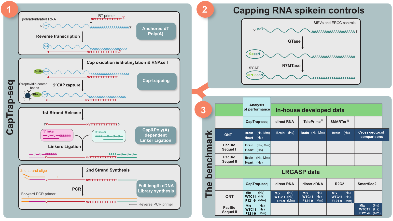 Our study assessed the performance of CapTrap-seq using human and mouse tissues, by comparing it with other RNA-seq library preparation methods across two sequencing technologies: Oxford Nanopore Technologies (ONT) and Pacific Biosciences (PacBio). A novel capping strategy for synthetic RNA sequences was implemented mimicking natural cap structures to test the quantitative and completeness capabilities of CapTrap-seq (Figure panel 2. Capping RNA Spike-in Controls)2.