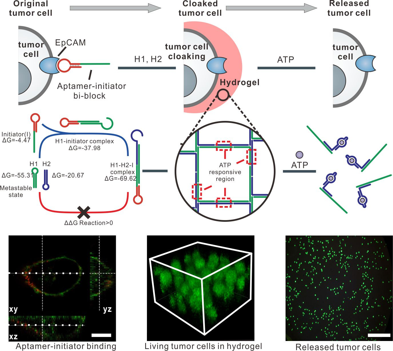 Aptamer that can specifically bind to the epithelial cell adhesion molecule (EpCAM) on the surface of CTCs is pre-hybridized with the initiator to trigger the clamped hybridization chain reaction. Due to the aptamer-initiator complex binding to EpCAM on the surface of CTCs, the 3D DNA hydrogel can be formed on the surface of CTCs by encapsulating the CTCs with a layer of soft DNA hydrogel (Figure 2). The soft property of the 3D DNA networks on cell surface can minimize the cell damage by encapsulating CTCs with high cell viability.