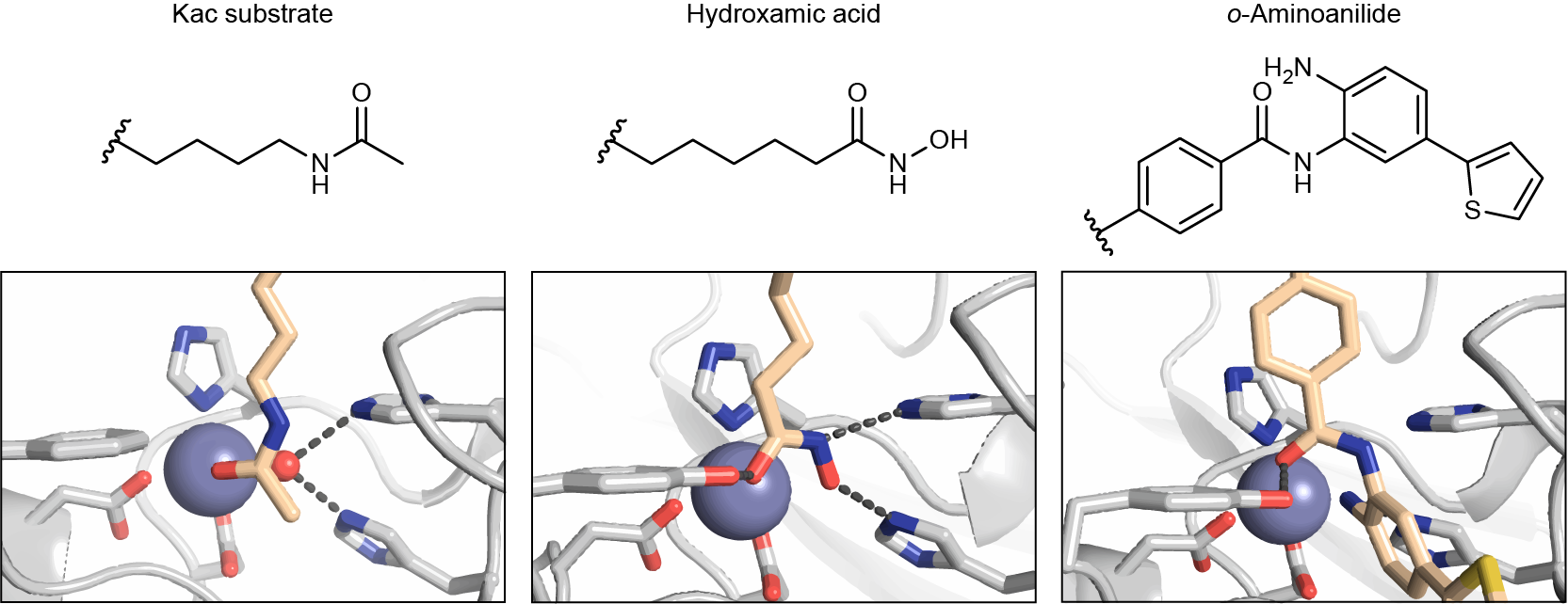 Figure 1. Binding of substrates and inhibitors to the active HDAC active site. Co-crystal structures of the nuclear enzyme HDAC8 with an Nε-acetyllysine (Kac) substrate (left, PDB 5DIC), a hydroxamic acid inhibitor (center, PDB 3EW8) and an ortho-aminoanilide inhibitor (right, PDB 4LY1); and chemical structures of the fragment of the ligand shown. The Zn2+ ion is represented as a purple sphere.