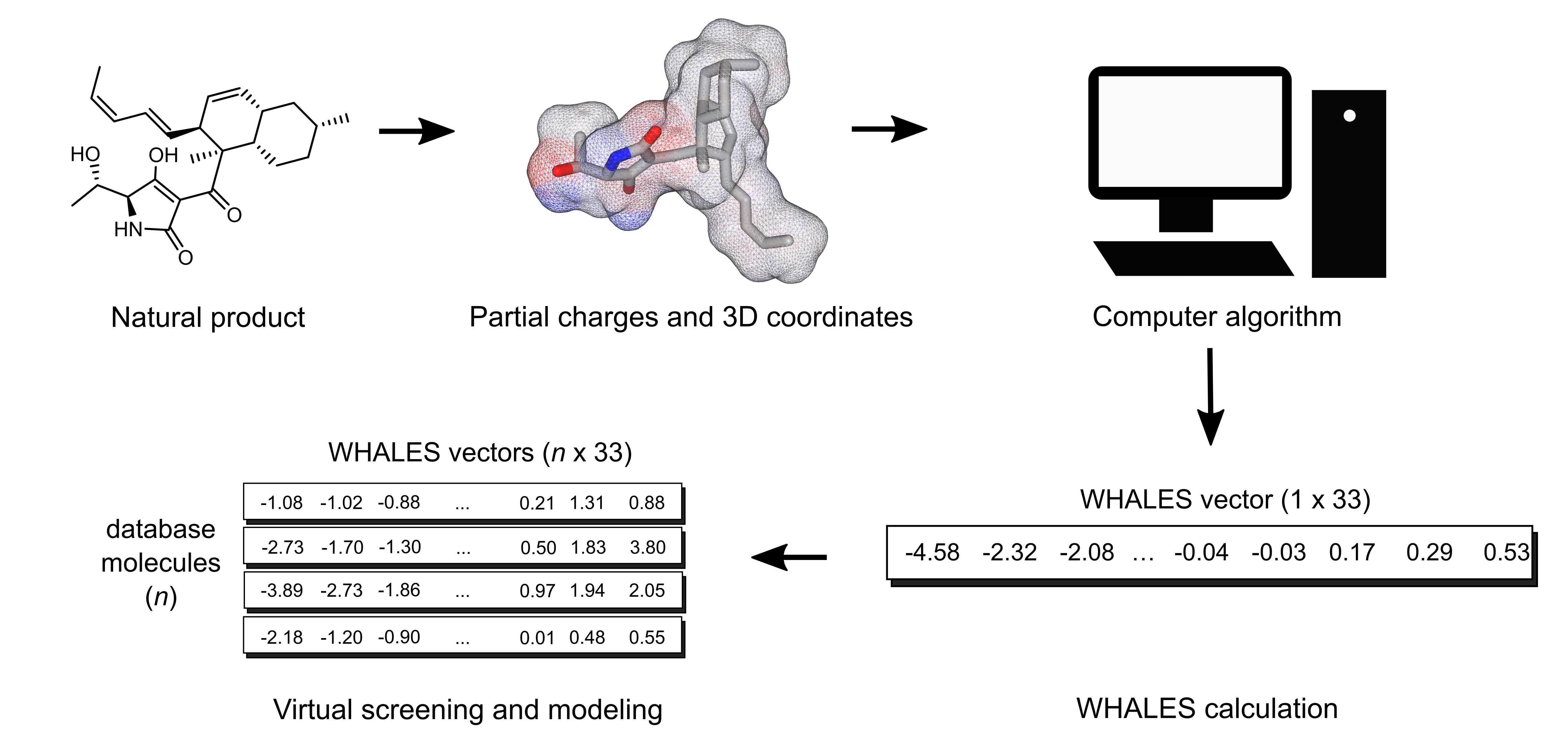 By melding recent statistical advances into pharmacologically-relevant chemical information, e.g., atomic partial charges and 3-dimensional conformation, we have developed the Weighted Holistic Atom Localization and Entity Shape (WHALES) description. This computational method encodes the patterns of shape, geometry and partial charges of natural products as numerical “fingerprints”. Such a molecular description can be used to identify synthetic compounds sharing the same patterns as the natural product templates, thereby potentially mimicking the same biological activity.