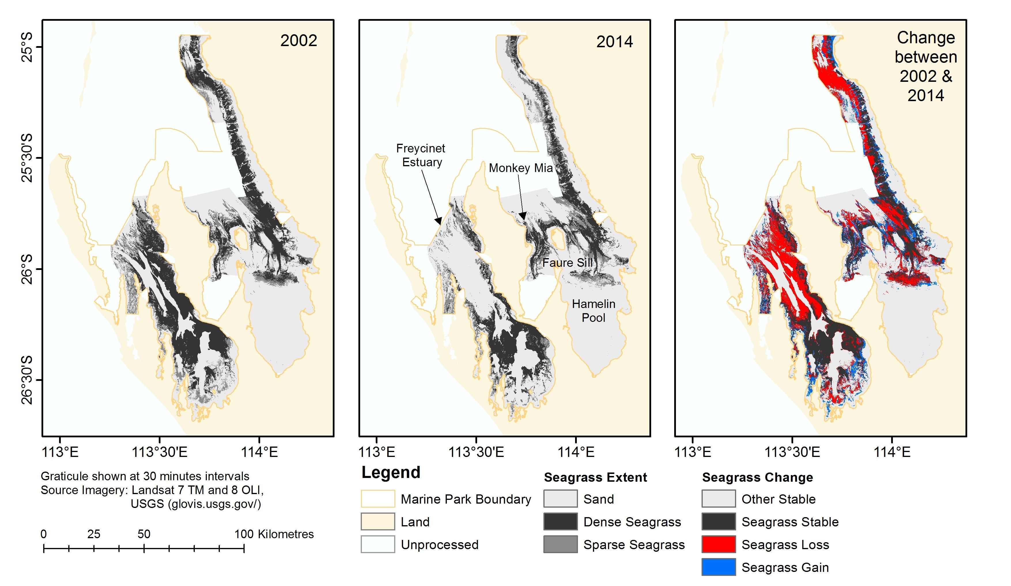 Seagrass extent change within Shark Bay's Marine Park before (2002) and after (2014) the marine heat wave in 2010/11