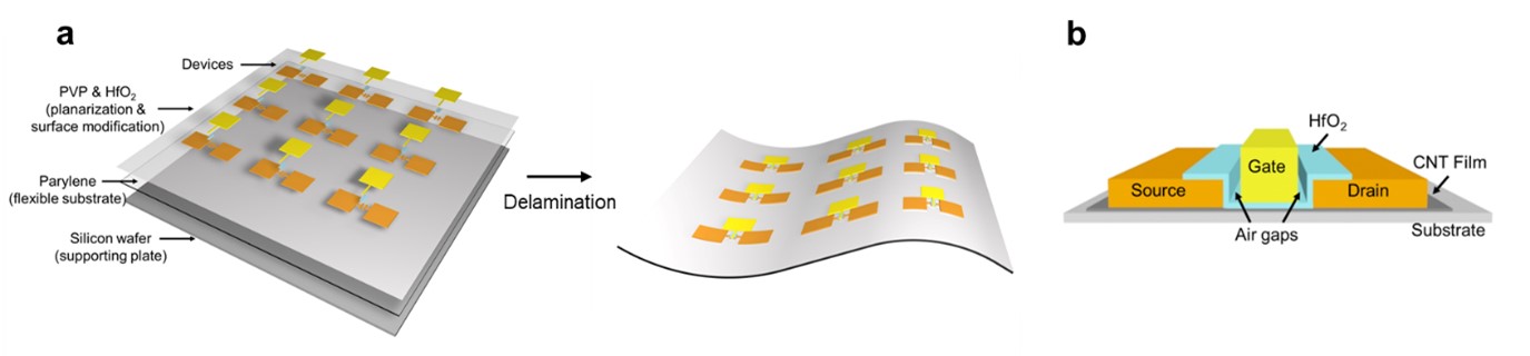 Fig. 1: CNT-TFTs fabricated on a flexible parylene substrate. a Schematic illustration of device and circuit fabrication on a flexible parylene substrate. b Schematic diagram of a flexible CNT-TFT.