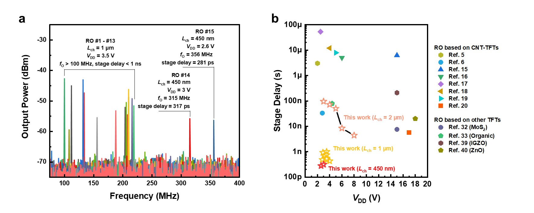 Fig. 2: Flexible CNT-TFT-based RO showing sub-nanosecond stage delays. a Power spectra of multiple 5-stage ROs with Lch of 1 μm and 450 nm, showing sub-ns stage delays. b Comparison of stage delays among representative flexible ROs.