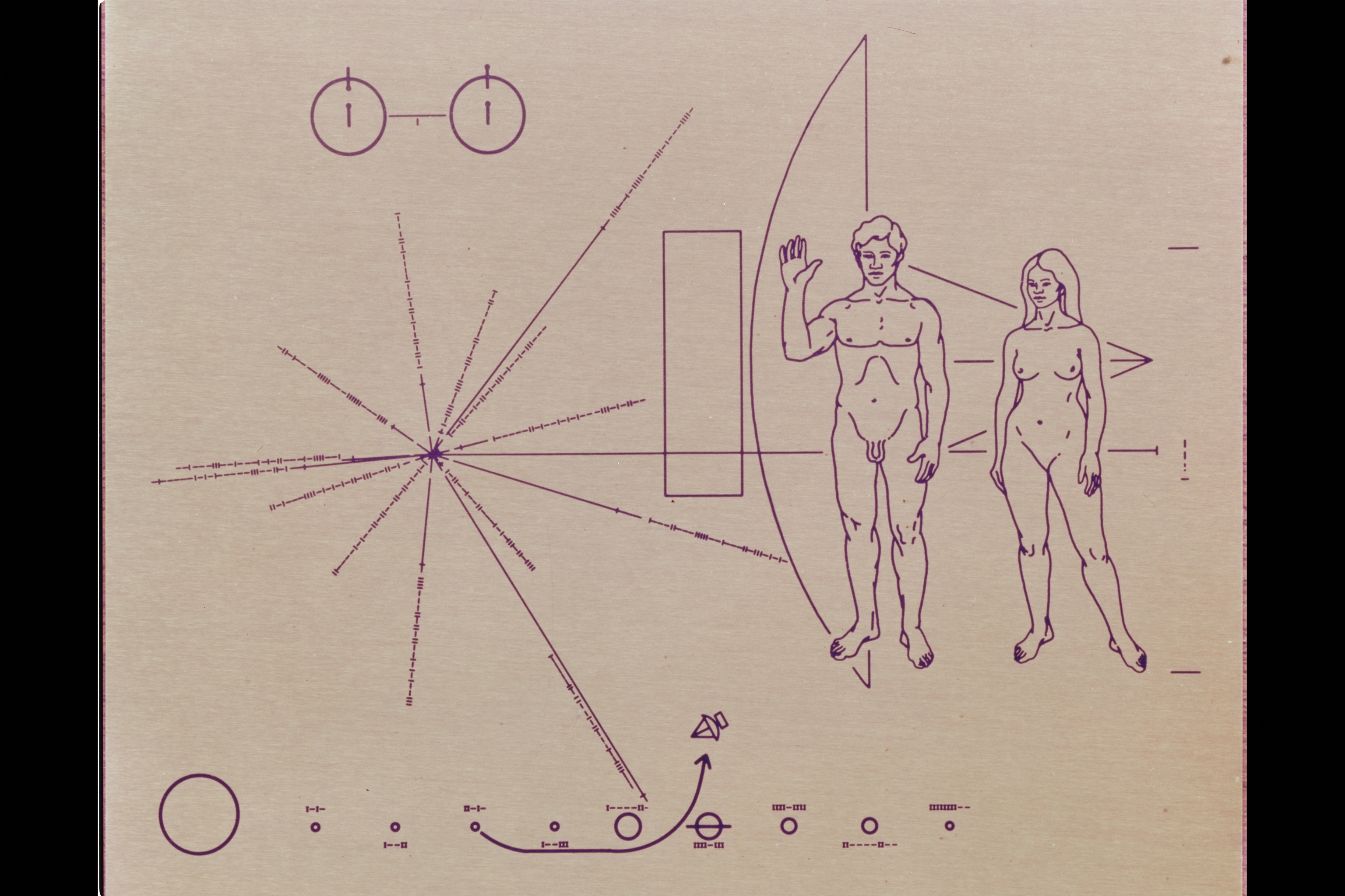 The plaque, and first message into space, designed by Dr Carl Sagan and Dr Frank Drake. The artwork was prepared by Linda Salzman Sagan. Image courtesy of NASA.