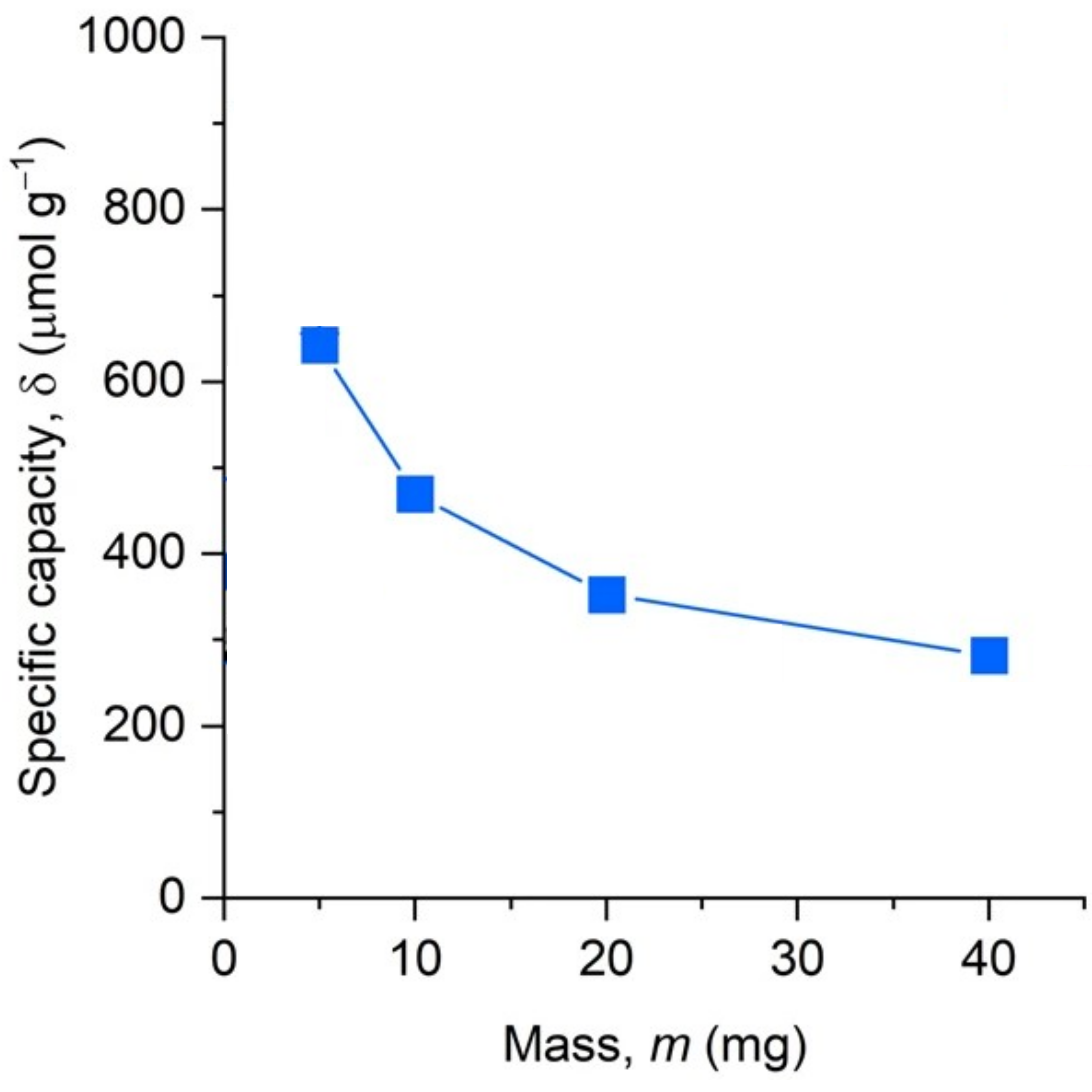 Specific capacity in μmol of electrons stored in one gram of carbon nitride vs. the mass of the material used in the photochemical experiment.