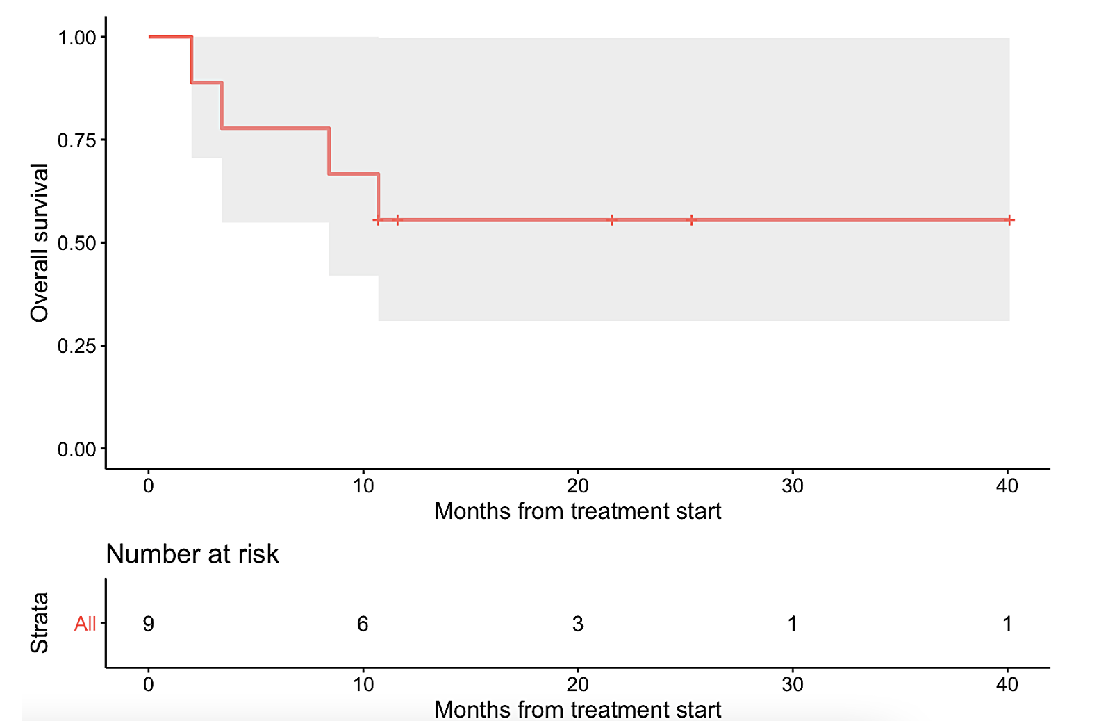 The gray shade areas represent the 95% confidence intervals, and bars denote censored observations. Median PFS was 11.3 months (95% CI: 3.4 – not evaluable) (panel a), while median OS was not reached (95% CI: 8.4 – not evaluable) (panel b).