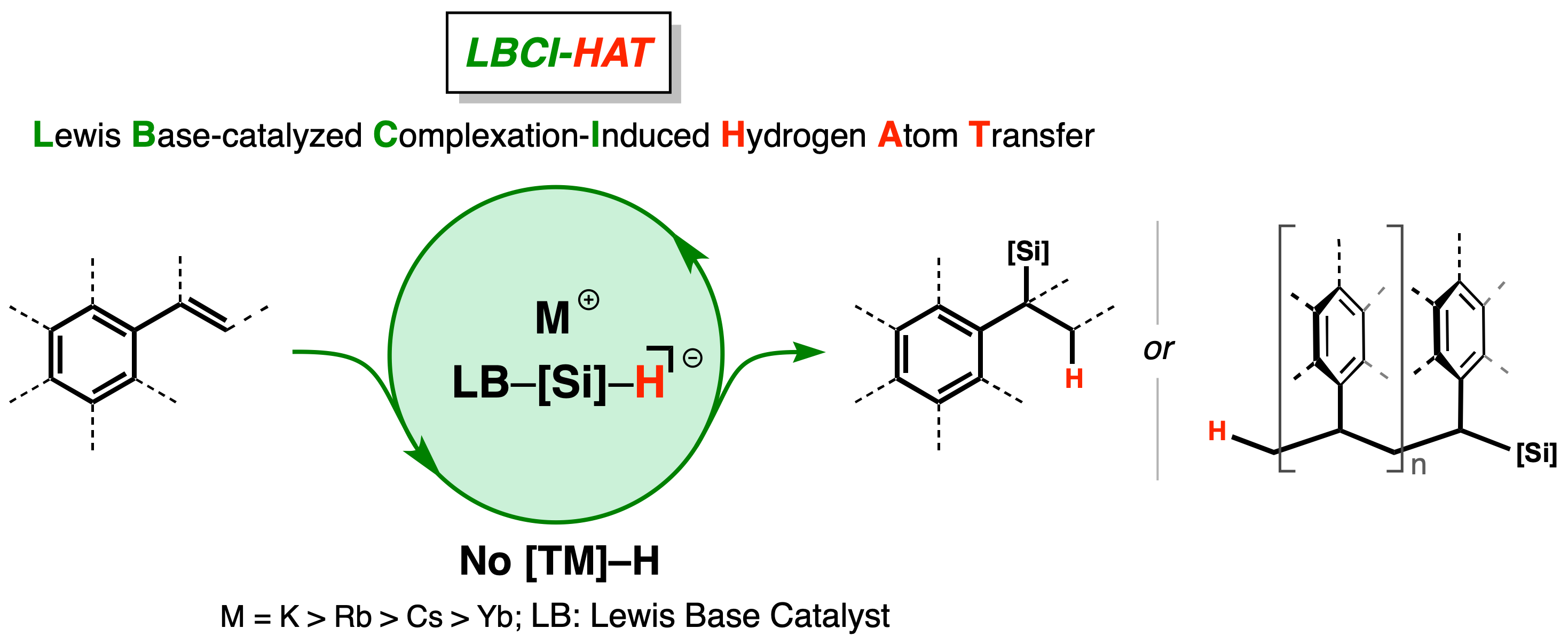 Being aware of the intricacy, the Jeon group considered a hypercoordinate hydridosilicon species as an alternative, more sustainable hydrogen source for HAT, in parallel with substantial recent efforts on the development of sustainable catalysis. Our hypothesis led us to develop a low-cost, environmentally friendly redox-neutral HAT process involving hydrosilanes and alkali metal Lewis base catalysts; namely, Lewis base-catalysed, complexation-induced HAT (LBCI-HAT). Notably, the LBCI-HAT provides both branch-specific hydrosilylation and polymerization of vinylarenes in a highly selective fashion, depending on the Lewis base catalyst employed. The outcome of these two processes has merit by virtue of silicon functionality in secondary organosilanes and polymers with silane-end functional groups, which allows further elaboration.