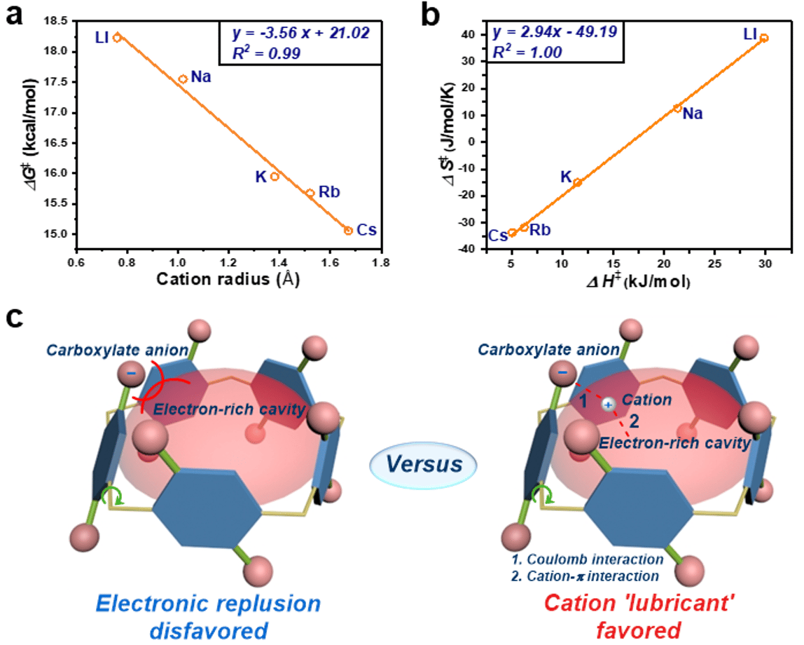 Fig. 2 (a) Correlation of the rotational barrier ΔG¹exp with corresponding cation radius. (b) Enthalpy-entropy compensation plot of WP5-M. (c) Illustration of electron repulsion between carboxylate anion and electron-rich cavity versus cation lubricant effect.