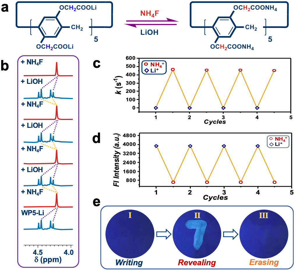Fig. 4 (a) Cation switch between Li+ and NH4+. (b) Partial NMR of switching control of rotors. (c) Switching of rate for WP5 in D2O at 298 K with multiple cycles of cation exchange. (d) Fluorescence response of WP5 (5.0 mM) at 471 nm upon multiple cycles of cation switch between Li+ and NH4+ in D2O (lex = 365 nm). (f) Revealing and erasing information with WP5 inks.