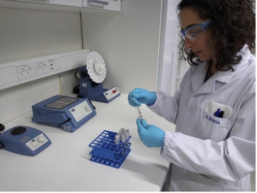 Anastasia Brozou processing bone collagen samples in the stable isotope lab of the Division of Soil and Water Management of the University of Leuven.