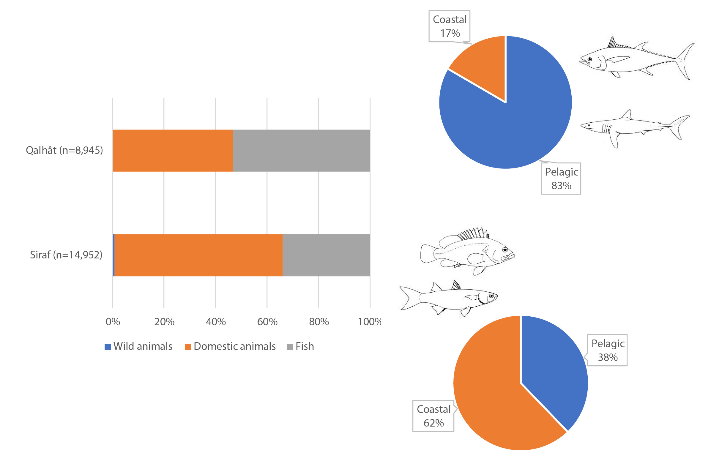 Not surprisingly given the coastal position of these sites, a heavy reliance on fish in the human diet was observed. Hence, we were expecting to obtain a very clear signal of fish in the carbon and nitrogen stable isotope results for the cats too. This was indeed the case for the cats from Qalhât that showed a very strong marine signal in the collagen of their bones. In fact, the values are the most elevated ever seen in hundreds of cats that we have so far analysed from other sites in our wide study region. The explanation lies in the fact that fish was no doubt an important part of their diet, but in particular in the fact that the majority of the fish landed at Qalhât were large pelagic species such as tunas and sharks.