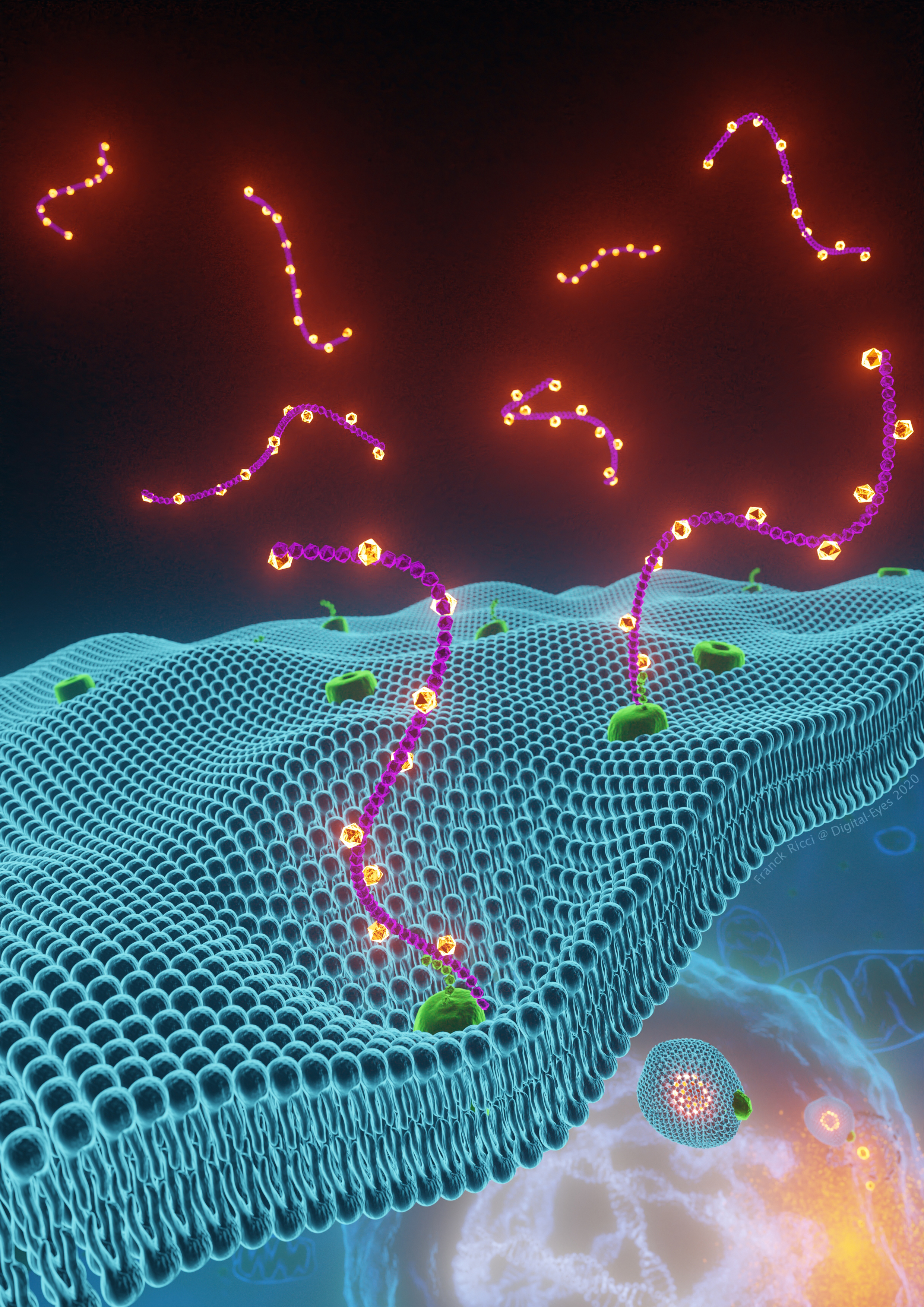 Fig. Iron-bound hyaluronates (orange spheres linked to purple strings) interact with the glycoprotein CD44 (green), at the plasma membrane (blue). These organometallic complexes are taken up by endocytosis to carry iron inside of cells. Iron is then used in mitochondria and the nucleus to alter the chromatin landscape through oxidative demethylation of repressive histone marks, thereby unlocking the expression of specific genes.