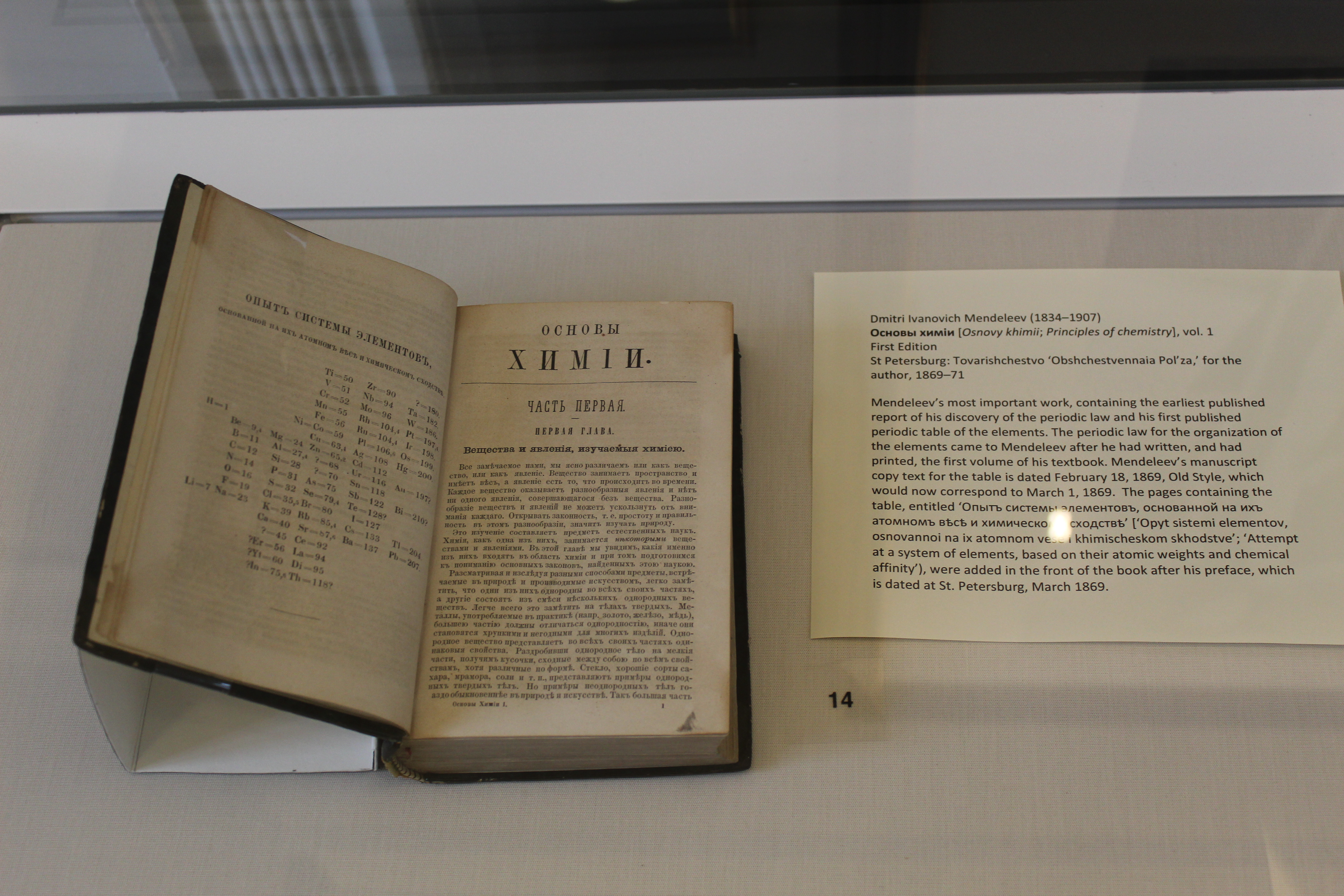 A special space is then designated for the first edition of Dmitri Mendeleev's Principles of Chemistry where the periodic table of chemical elements was published for the very first time in 1869.