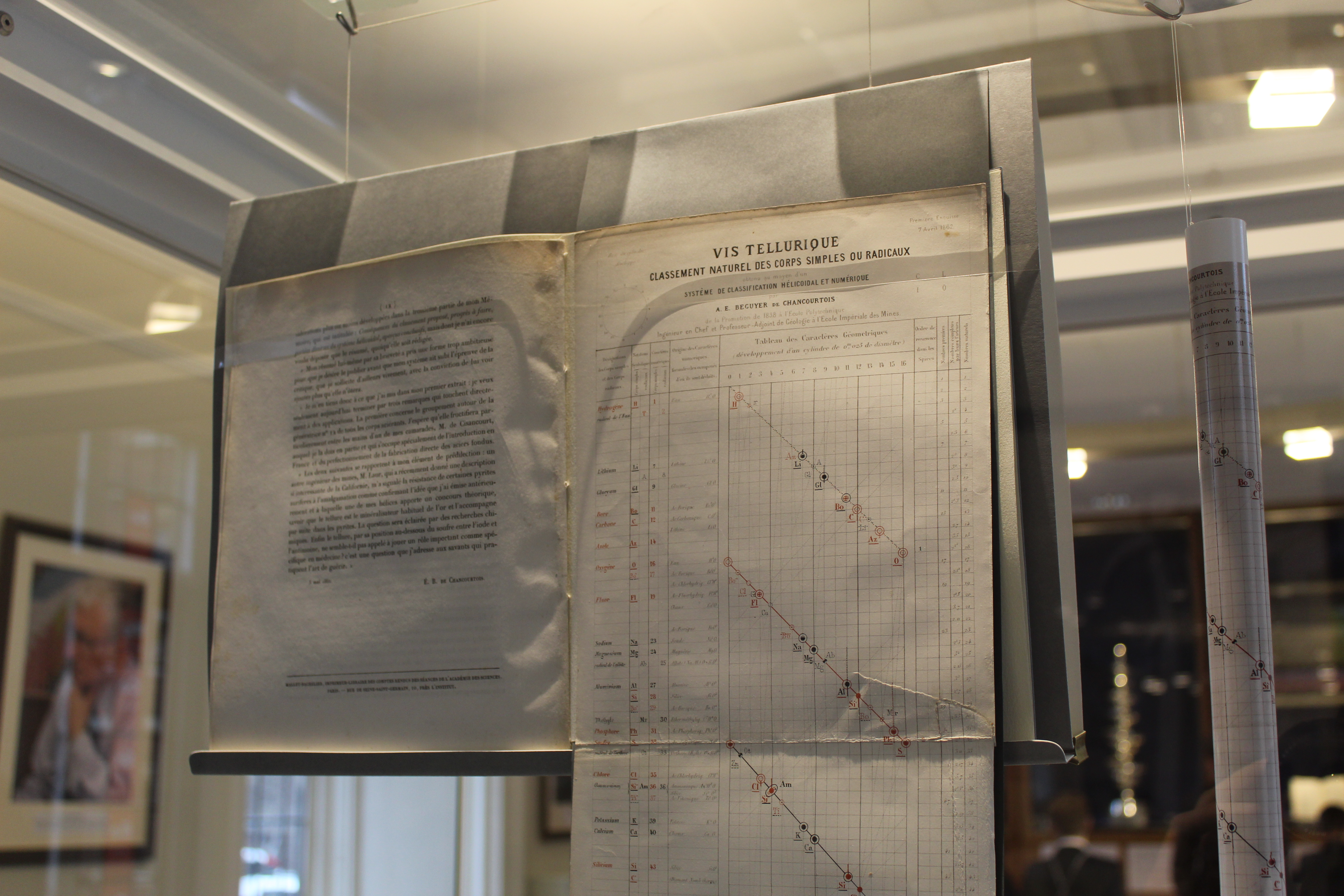 The exhibition starts from the first list of elements which emerged around the time of the French Revolution in the late 18th century, and the first list of atomic masses drawn up by English chemist, John Dalton (see: Dalton's atomic theory). Then, items on display explore six different chemists from around the world who came up with their own versions of the periodic table. These remarkable items include: the incredibly rare Alexandre-Émile Béguyer de Chancourtois's vis tellurique (telluric screw) and John Alexander Newlands and William Odling's versions of the periodic table.