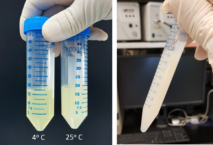 Upon obtaining the protein extracts from these mushrooms, we made an interesting observation. Precipitation of a white particulate material occurred for all three extracts at room temperature, but at different rates. Precipitation could be slowed down by keeping the extracts in the refrigerator and accelerated by boiling them. Importantly, we could resuspend the collected particulates in water to form a fine, homogenous suspension (bottom pic, right) that could function as a cell-adhesive matrix for cell culture.